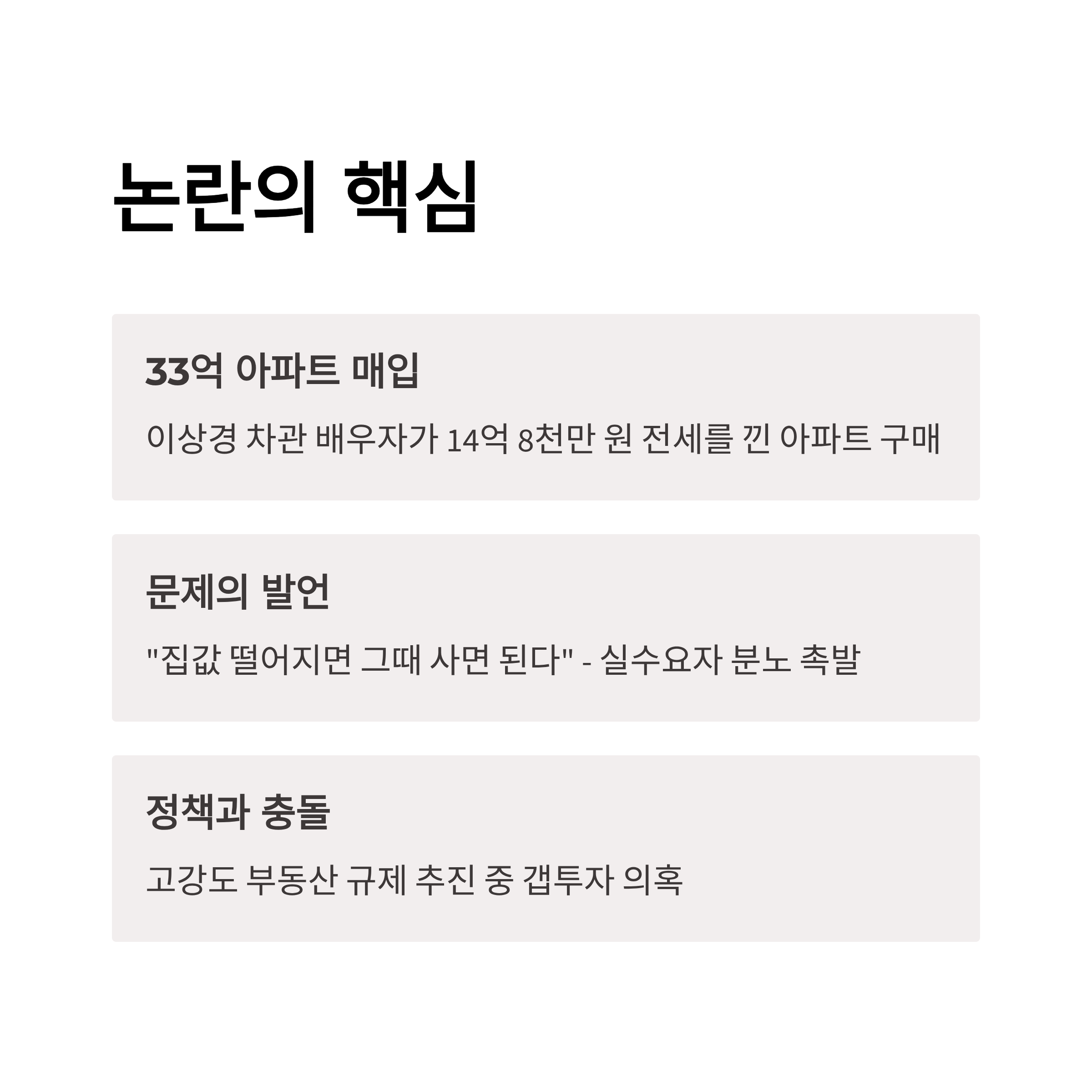 1. 이상경 차관은 배우자의 33억 아파트 갭투자 논란과 "집값 떨어지면 사면 된다"는 발언으로 비판의 중심에 섰습니다.
