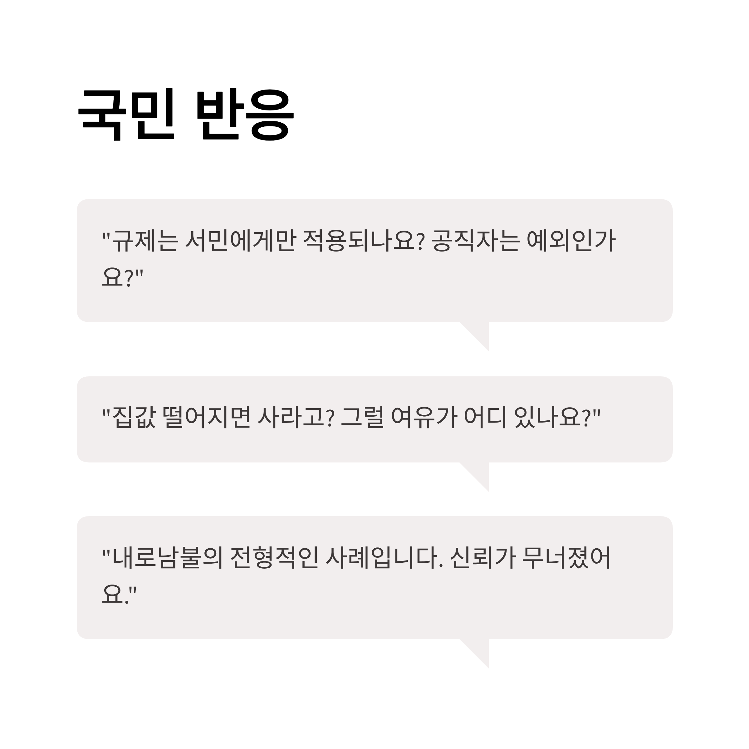 4. 해당 사건으로 부동산 정책 신뢰도에 큰 타격이 가해지고, 국민적 여론은 악화되고 있습니다.