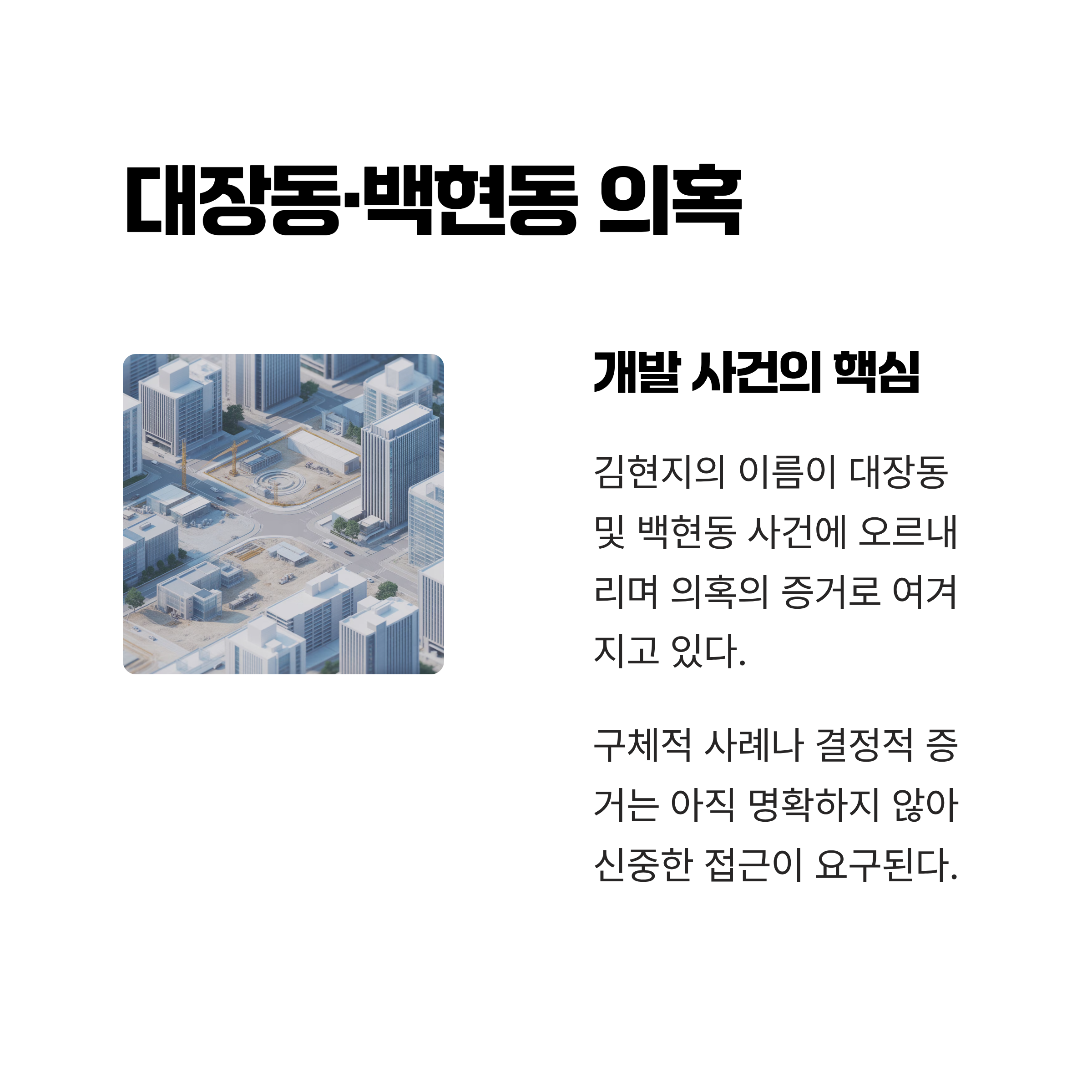 4. 김현지는 대장동 및 백현동 사건, 그리고 도시개발 논란 관련 의혹의 중심에 있음.