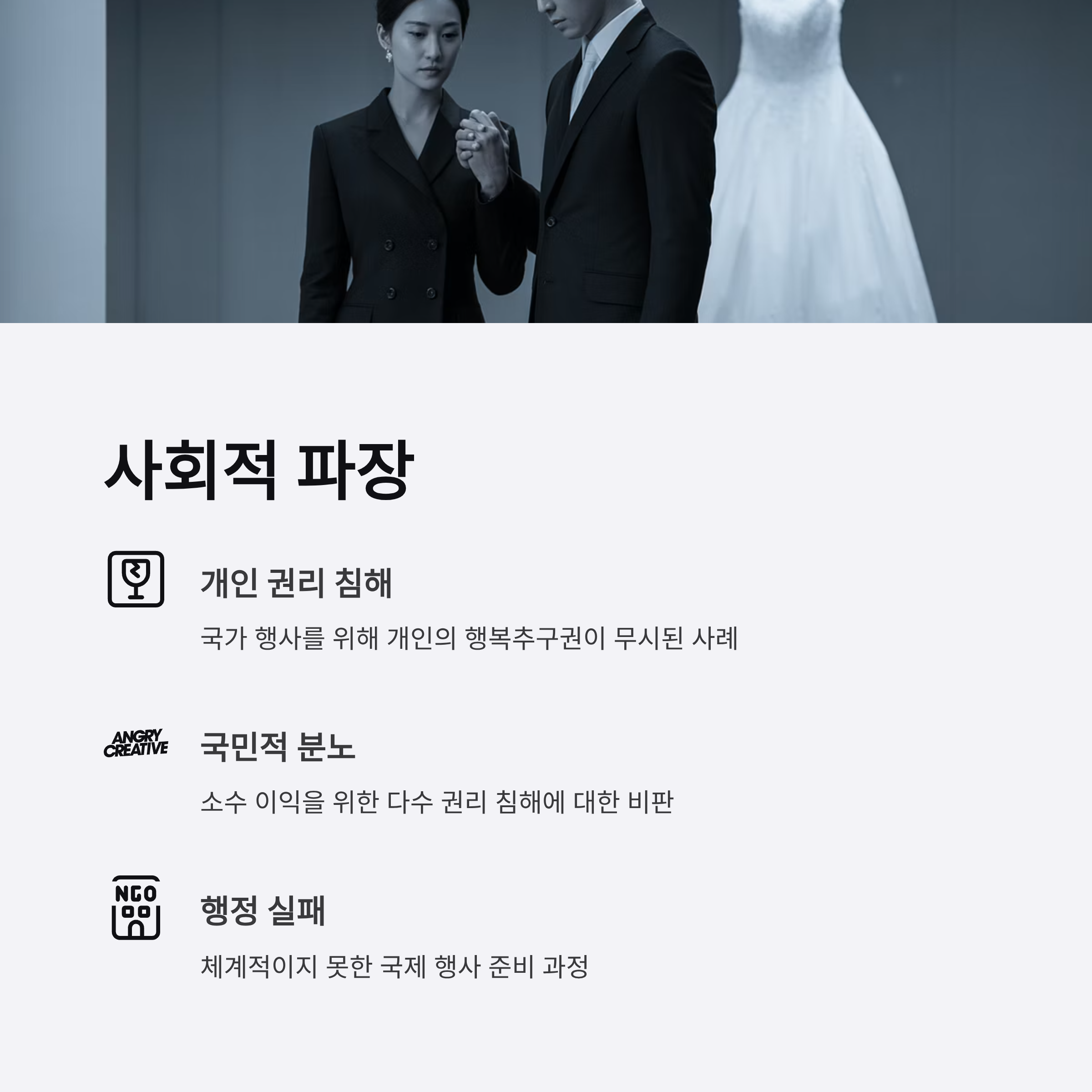 호텔 신라 결혼식 취소 사례는 국민적 관점에서 정부와 대형 기업 간의 조율 부족을 상징적으로 보여준 사건입니다. APEC과 같은 국가 정상급 회의는 중요한 외교적 이벤트지만, 이에 따른 국민 개개인의 권리 침해는 논란을 초래하고 있습니다. 청첩장 배부 등으로 결혼 준비가 대부분 진행된 상황에서 결혼식이 취소된 당사자들에게는 금전적 손실뿐만 아니라 감정적인 충격까지도 가중되었습니다. 이는 단순히 사과나 금전적 보상이 아닌, 국민 중심의 행정 프로세스를 재구성할 필요성을 시사합니다.