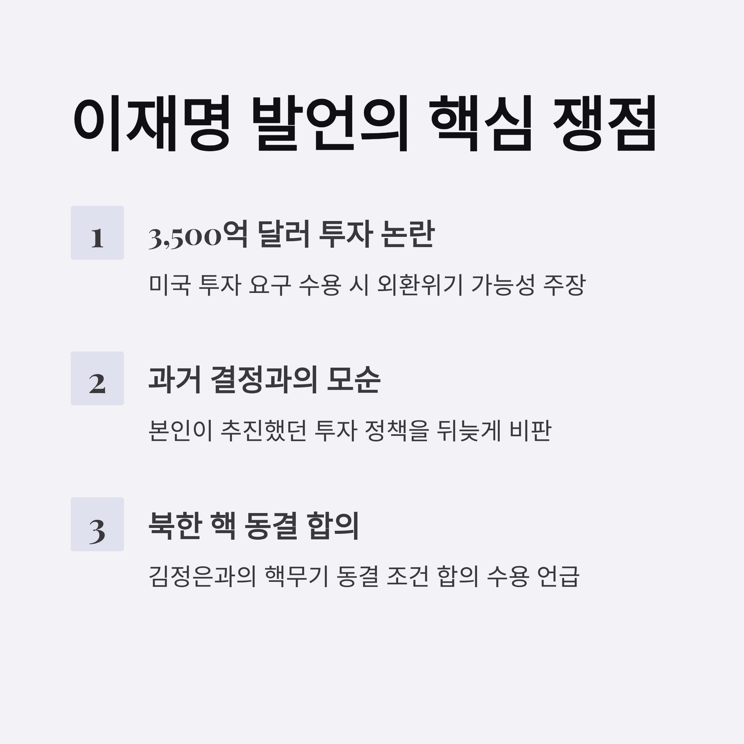 1. 이재명 의원은 외신 인터뷰에서 외환위기 가능성을 주장하며 미국 투자 요청을 비판하였으나, 정치계와 여론의 강한 반발에 직면했습니다.