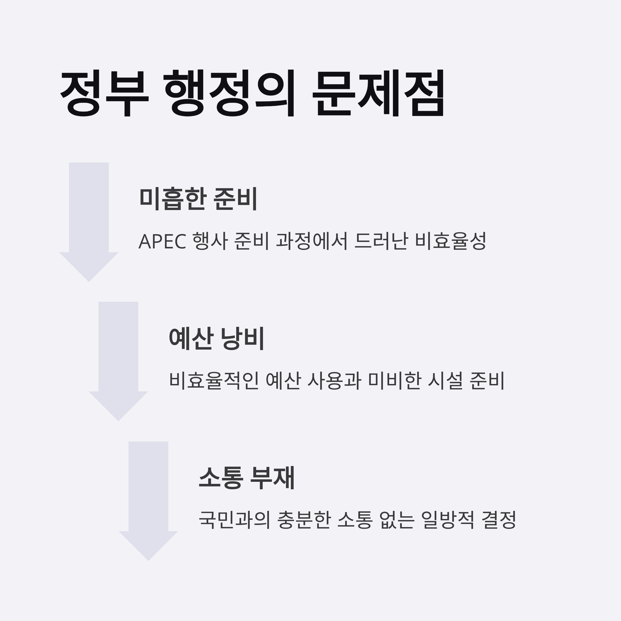 이번 논란을 통해 드러난 정부의 문제는 단순히 조율 부족에서 그치지 않았습니다. 특히 APEC 회의 장소를 결정하는 과정에서 사전 준비와 다자 간 협의의 부족은 복잡한 국내외 변수들을 간과했음을 보여줍니다. 미리 준비하지 못한 것이 결국 국민의 기본권을 침해하는 결과로 이어졌으며, 이는 행정의 투명성과 효율성 문제로 확대될 수 있습니다. 다가오는 국제회의 준비 시, 정부와 기업, 시민 간의 긴밀한 조율 구조를 구축할 필요가 있습니다.