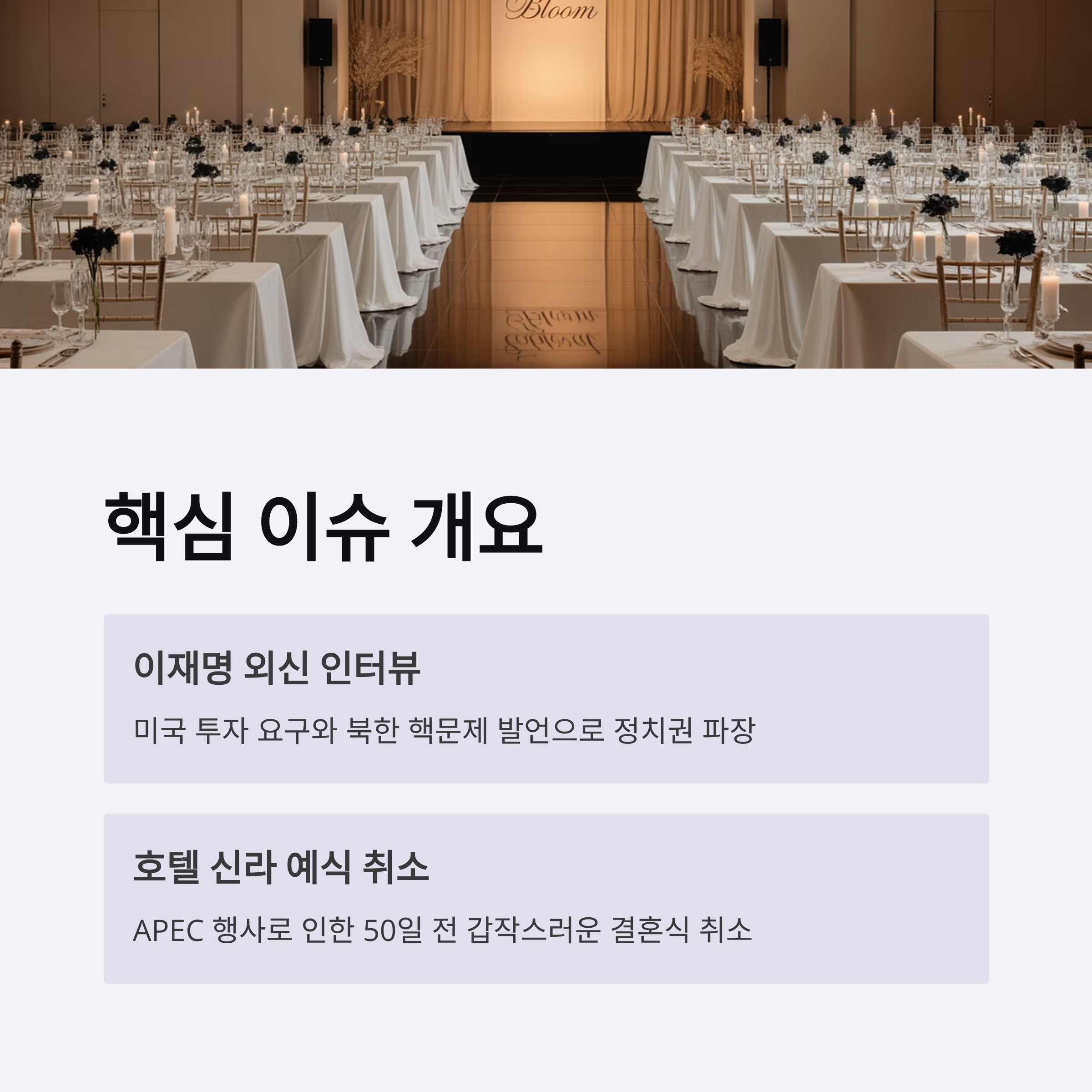 3. 두 번째 이슈는 APEC 정상회담 준비를 이유로 호텔 신라가 예비부부의 결혼식을 취소하며, 개인 권리 침해 문제가 부상하였습니다.