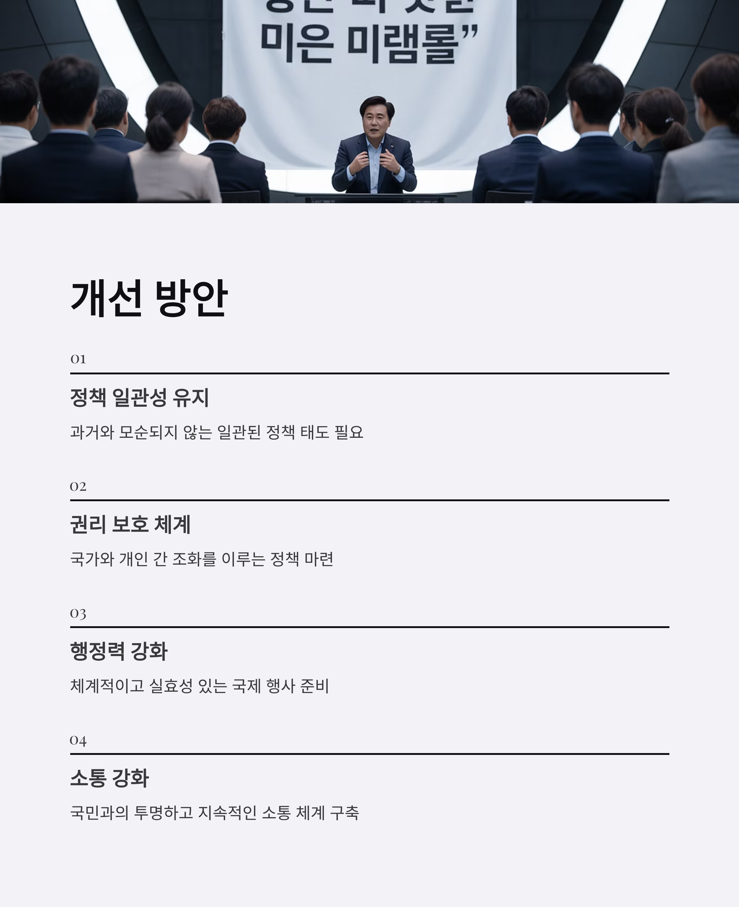 이번 사건들은 정치와 외교, 그리고 사회적 신뢰에 미치는 영향을 보여주는 중요한 사례로 평가됩니다. 이재명 의원의 발언은 국제적 압박에 대한 민감성을 키우면서도 정치적 혼란을 증폭시켰고, 호텔 신라 사건은 국민들이 느낄 수밖에 없는 행정의 허술함을 드러냈습니다. 이를 해결하기 위해서는 다음의 세 가지 방안을 제안하고자 합니다. 첫째, 국가 정책의 메시지와 행보 간 일관성을 높여야 합니다. 이는 대외 신뢰도뿐 아니라 국내 균열을 최소화하는 데 도움을 줄 것입니다. 둘째, 정부는 국제적 행사에 대해 국민과 적극 소통하여, 이해와 협력을 얻는 방식으로 문제를 해결할 필요가 있습니다. 셋째, 장기적인 시각으로 국민 권리와 공익의 균형을 맞추는 법과 행정을 구축해야 합니다.
