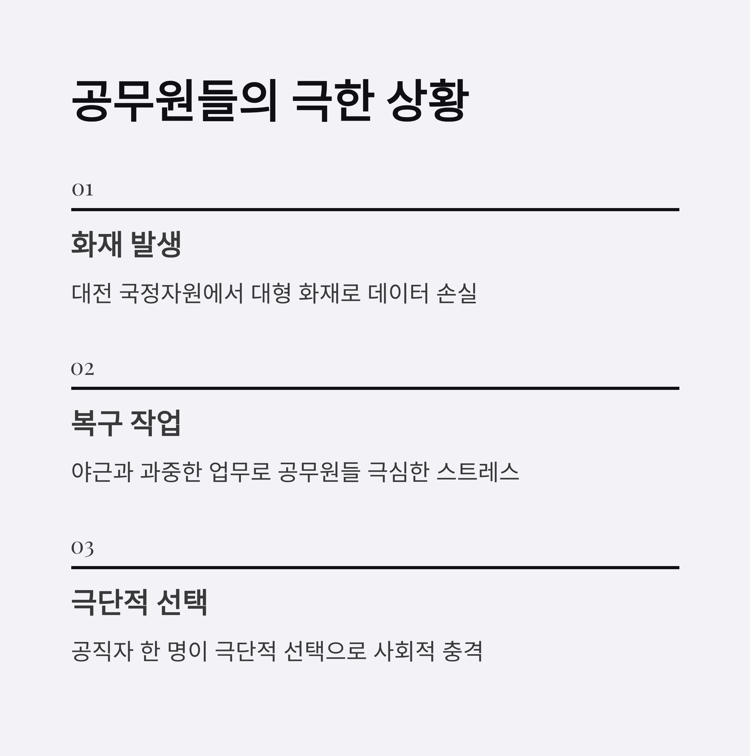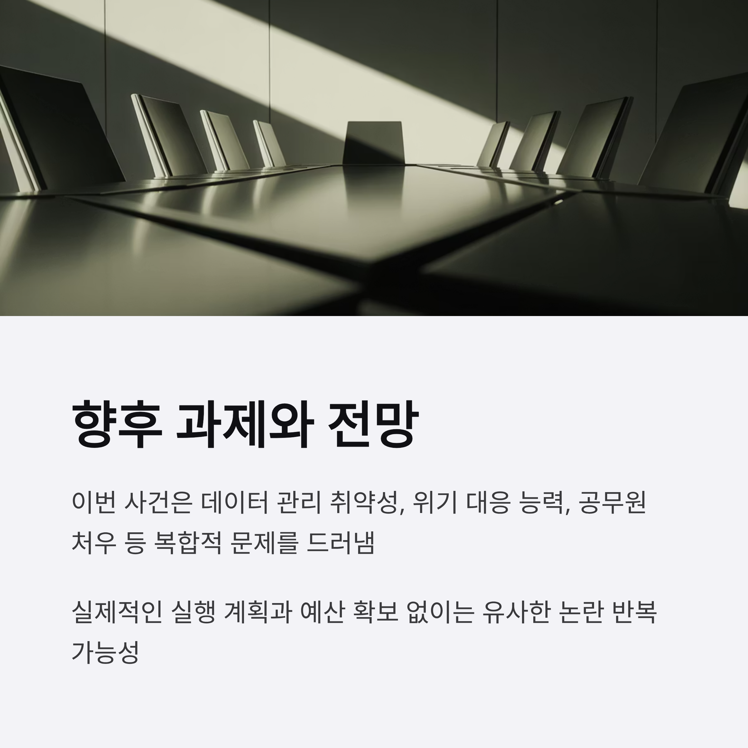 대규모 데이터 손실과 후속 복구 작업의 부담은 수많은 공무원에게 막대한 정신적, 육체적 스트레스를 안겼다. 극단적인 선택을 한 공직자 사망 사건은 단순히 개인적인 문제가 아닌 공공부문 전반의 근무 환경을 재조명해야 할 이유를 제공한다. 특히 국가적 위기 발생 시, 공무원들에게 큰 책임이 부여되지만 그들의 안전망은 여전히 미흡한 상태다. 이는 비단 현재 사건뿐 아니라, 향후 비슷한 상황에 대비하기 위해서라도 반드시 개선해야 할 문제로 간주된다.