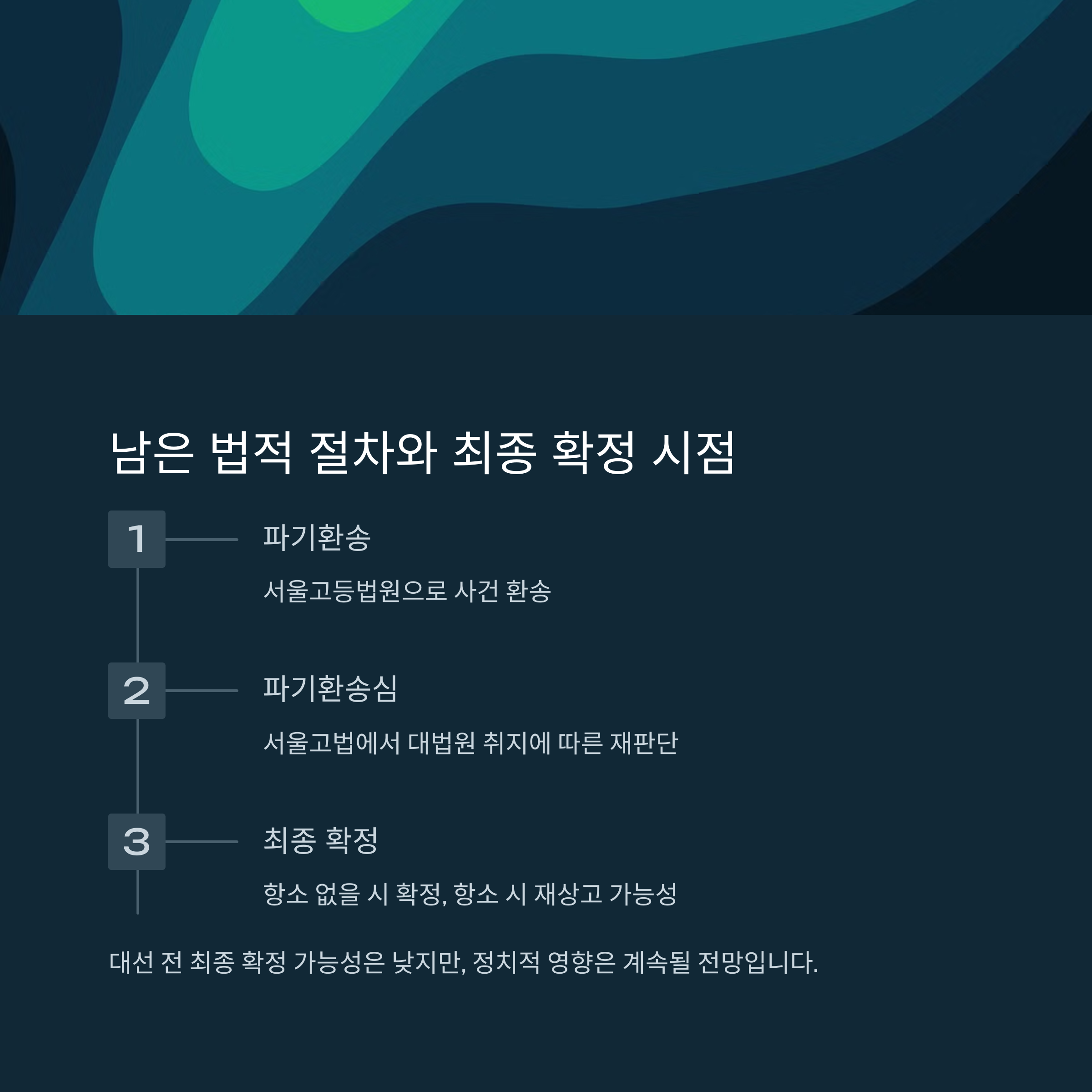 벌금 100만 원 이상의 형이 확정되면 공직선거법에 따라 대통령 선거 출마가 불가합니다. 하지만, 환송심 판결이 늦어져 대선 시점까지 형량이 확정되지 않을 경우에는 출마 자체는 가능하다는 점이 변수로 작용할 수 있습니다. 이는 대선 전까지 사법적 불확실성을 끌어안고 선거를 치르는 사례가 될 가능성이 있음을 의미합니다.