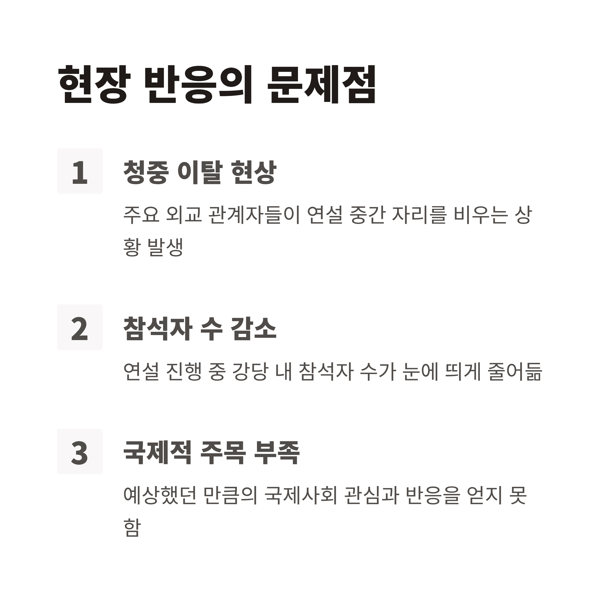 - 강당의 주요 외교 관계자들이 연설 중간 자리를 비우거나 참석자 수가 줄어드는 현상이 논란이 되었습니다.