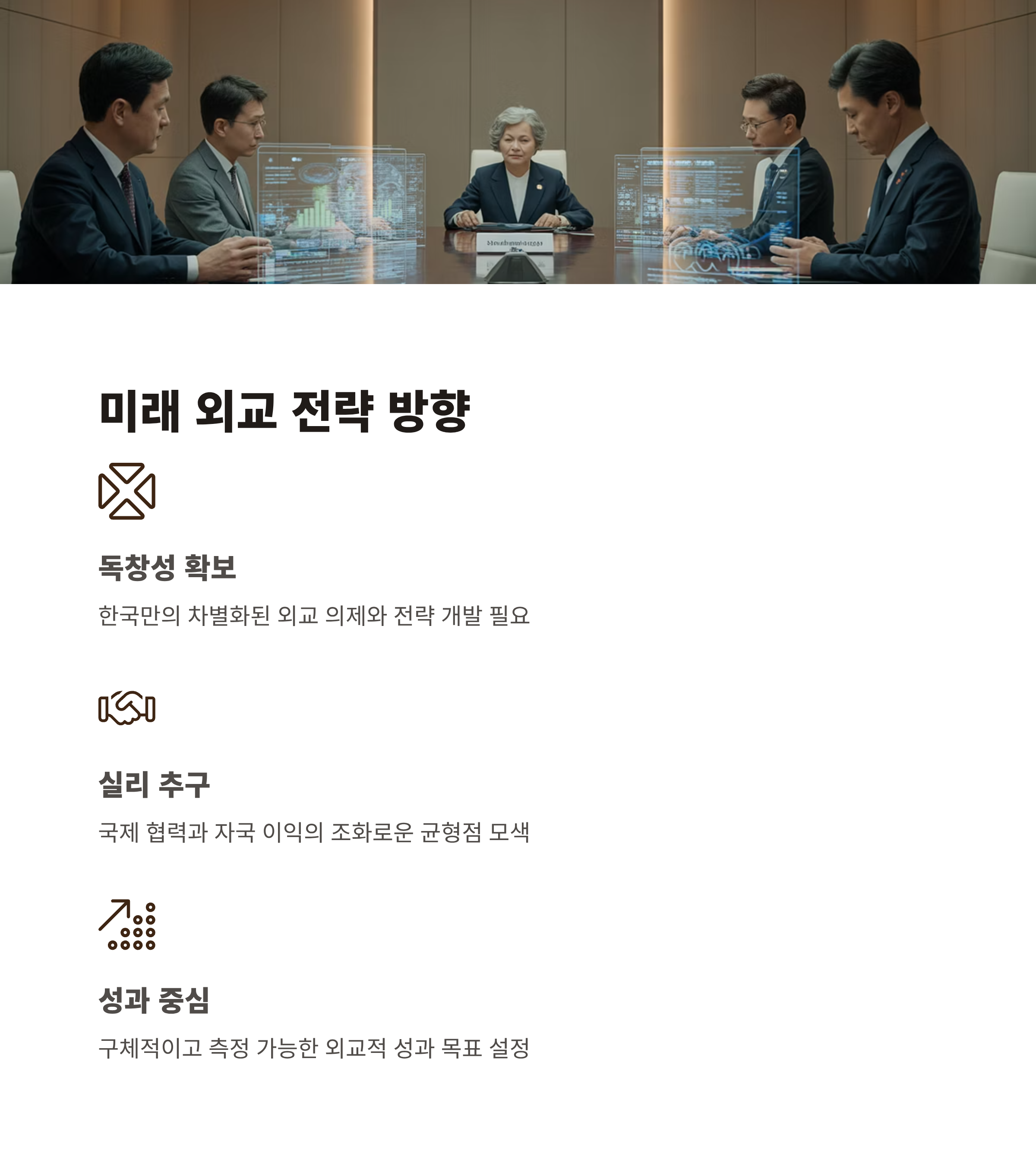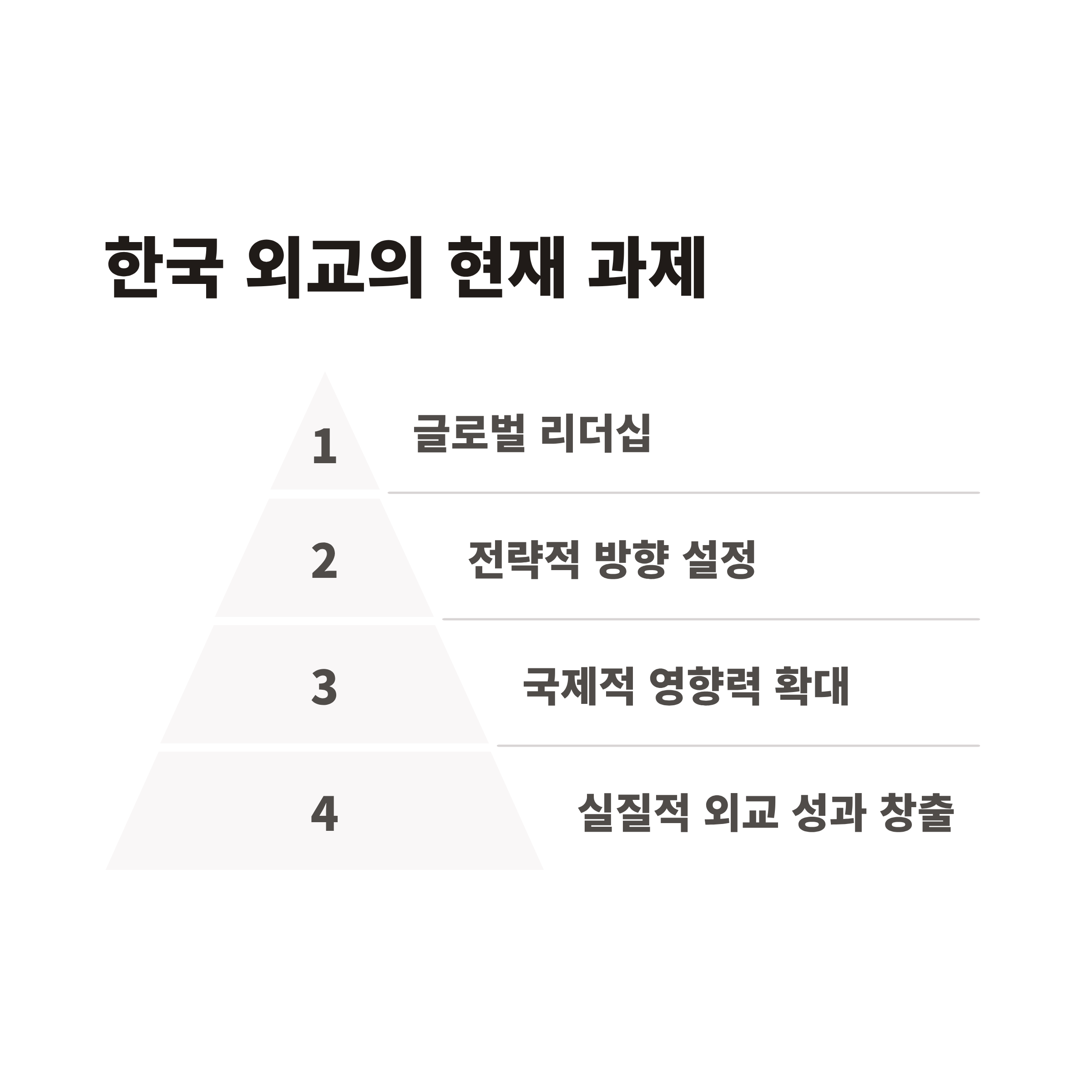 - 한국 외교는 현재 글로벌 리더십을 발휘하는 데 필요한 전략적 방향 설정이 요구되는 상황입니다.
