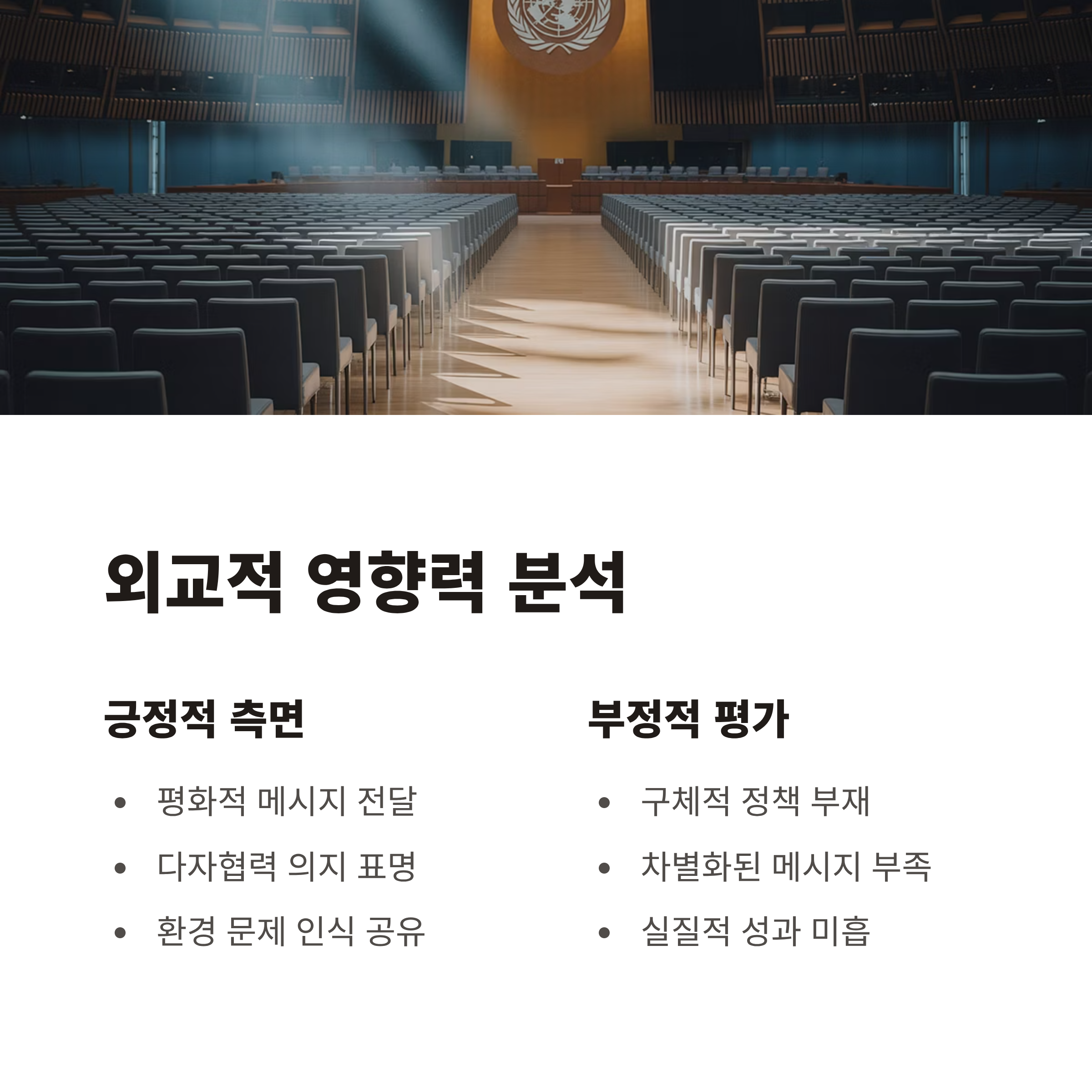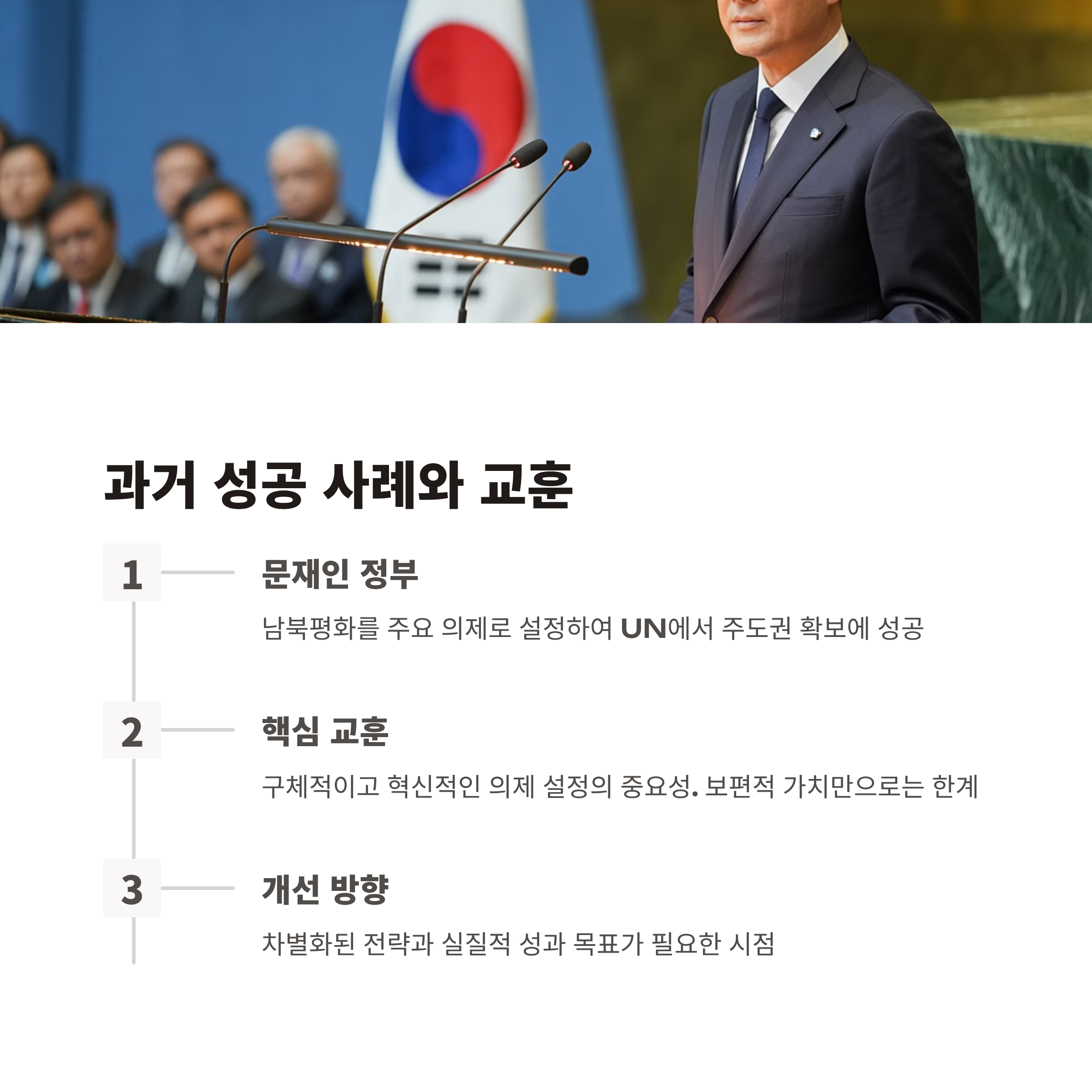 트럼프와 같은 강경 외교를 구사한 지도자는 반발을 불러일으키더라도 강력한 인상을 남겼습니다. 반면, 이재명 대통령은 유연한 다자외교를 강조했지만 국제적인 주목을 한 데에는 성공적이지 못한 것으로 보입니다. 과거 한국의 문재인 정부에서는 남북평화를 주요 의제로 삼고 UN 연설에서 주도권을 확보한 바 있습니다. 이를 통해 알 수 있는 교훈은 구체적이고 혁신적인 의제 설정이 필요하며, 단순히 보편적인 가치를 내세우는 것만으로는 한계가 있음을 의미합니다.