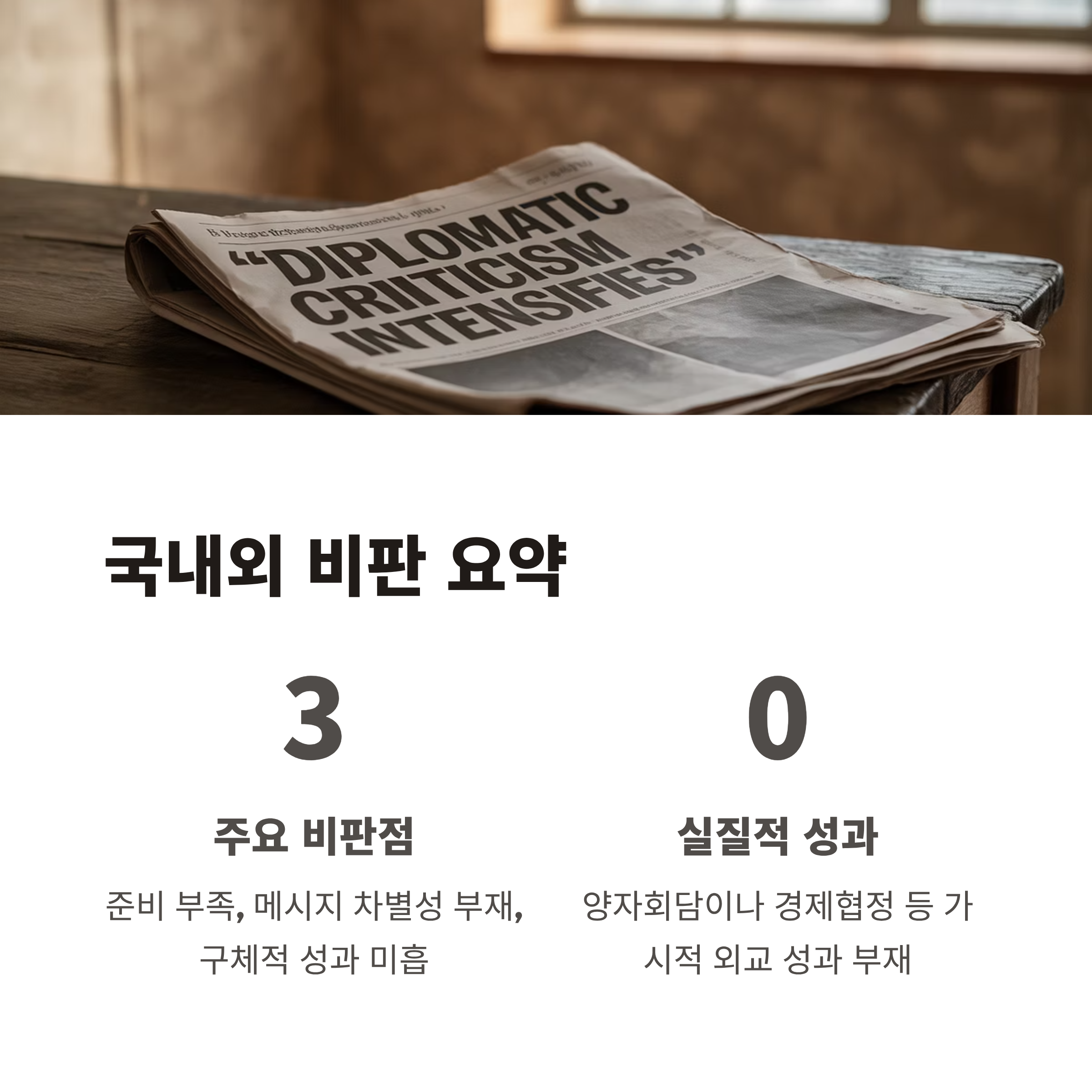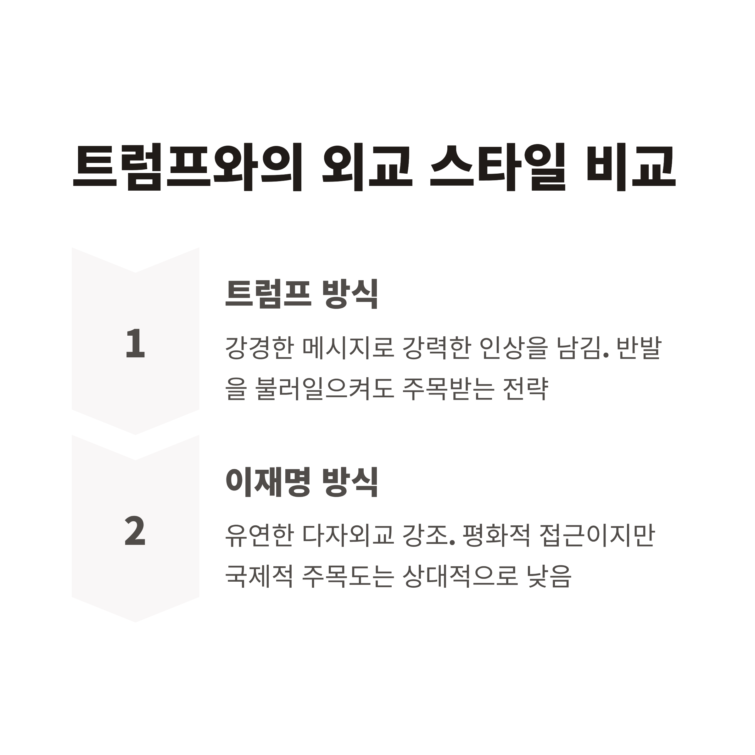 - 도널드 트럼프와 달리 이재명 대통령은 유연한 다자주의 협력을 표방했으나, 실질적 외교 성과는 부족하다는 비판이 나왔습니다.