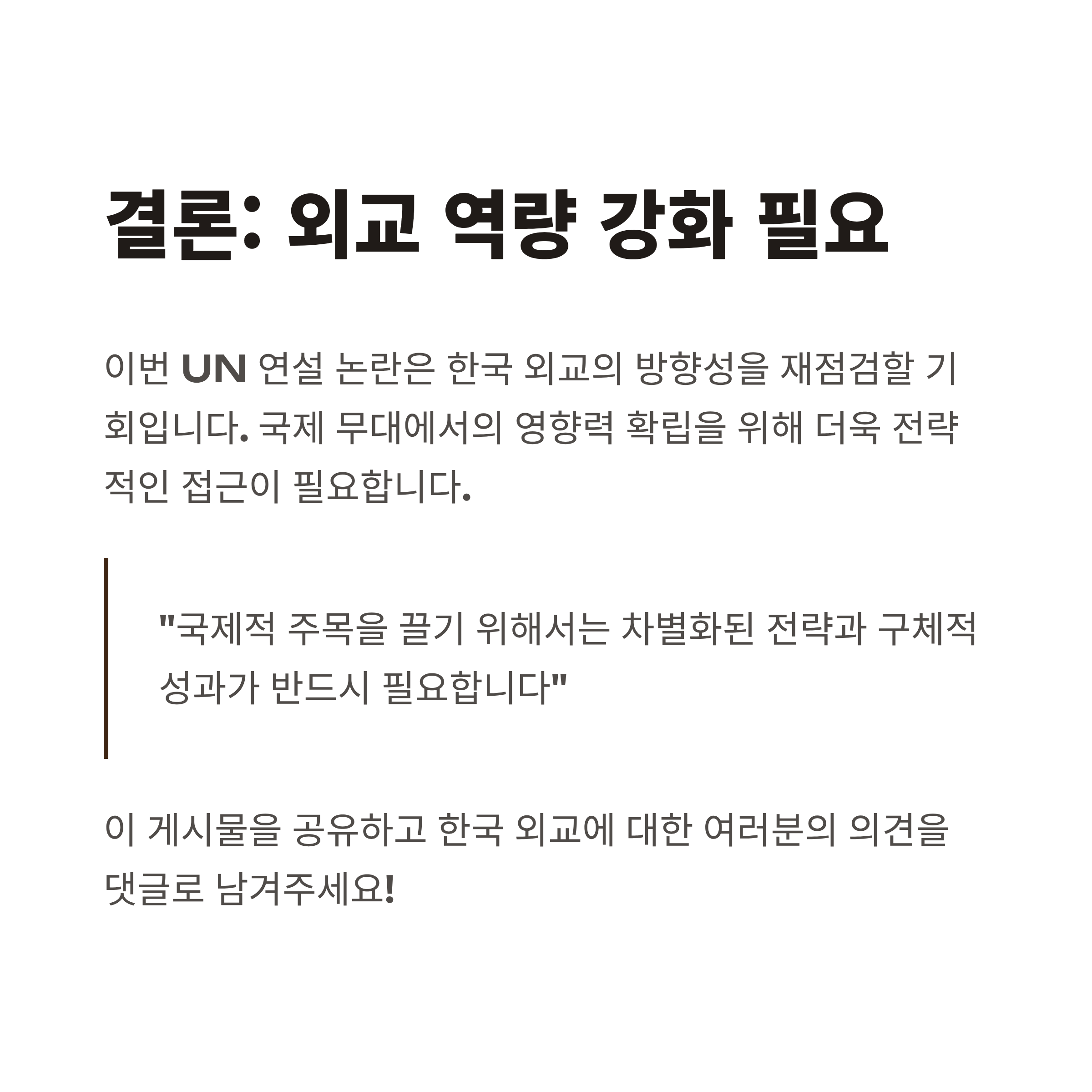 UN 연설과 관련된 논란은 단순히 한 사람의 발표 능력 이슈에 그치지 않습니다. 이는 대한민국 외교 전반의 방향성과 역량을 반영합니다. 이재명 대통령의 연설은 메시지 수준에서는 큰 오점을 남기지 않았지만, 국제적 무대에서 소리를 내고 영향력을 확립하기에는 부족함이 드러났습니다. 앞으로는 국제 무대에서의 독창성과 구체적 성과를 목표로, 균형 잡힌 외교 전략을 개발하고 이행하는 노력이 필요합니다. 특히 국제 협력과 자국의 실리를 조화시키는 방법에 대한 심도 깊은 고민과 실행이 요구됩니다.