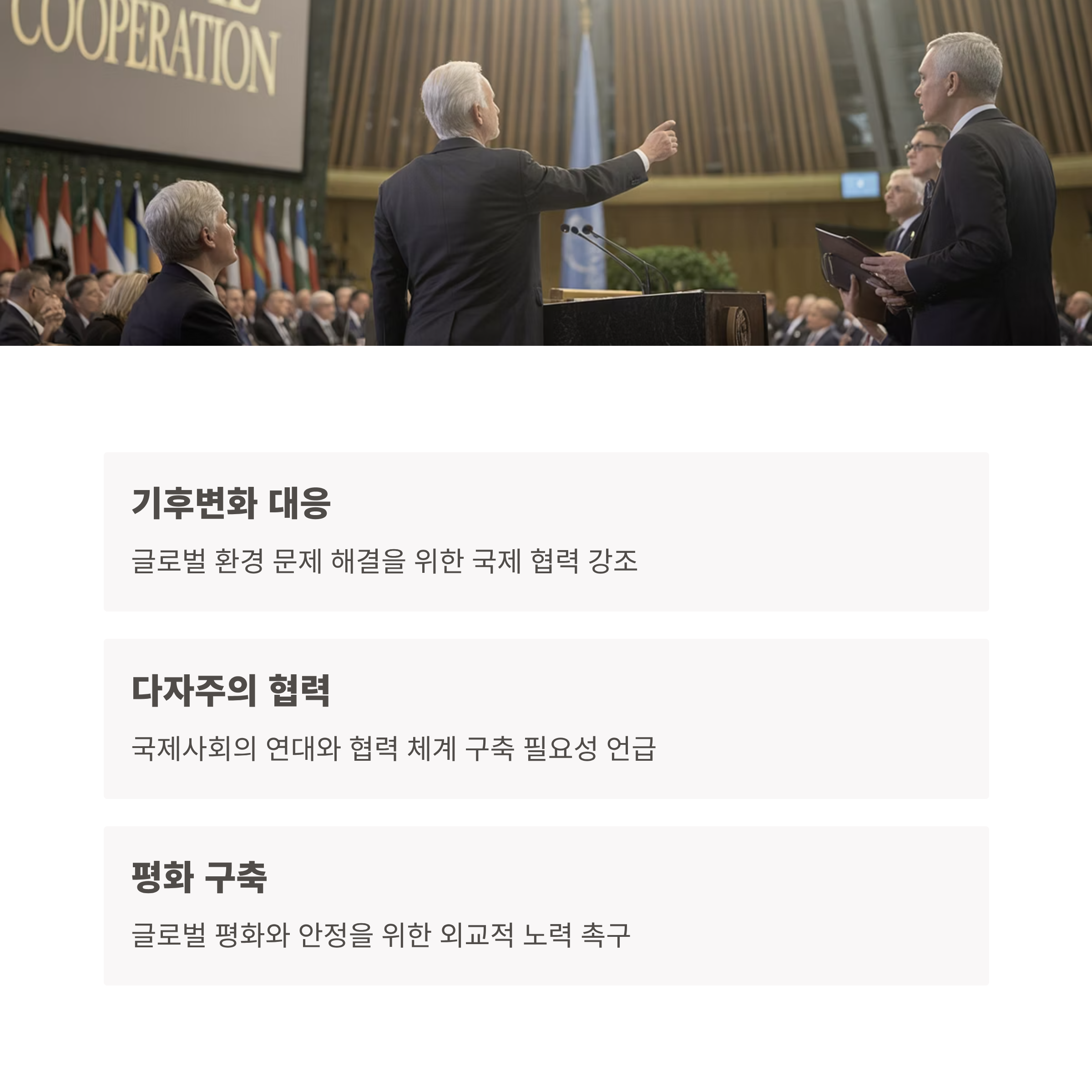 - 이재명 대통령은 UN 연설에서 기후변화 대처와 다자적 협력을 언급하며 평화 구축을 호소했습니다.