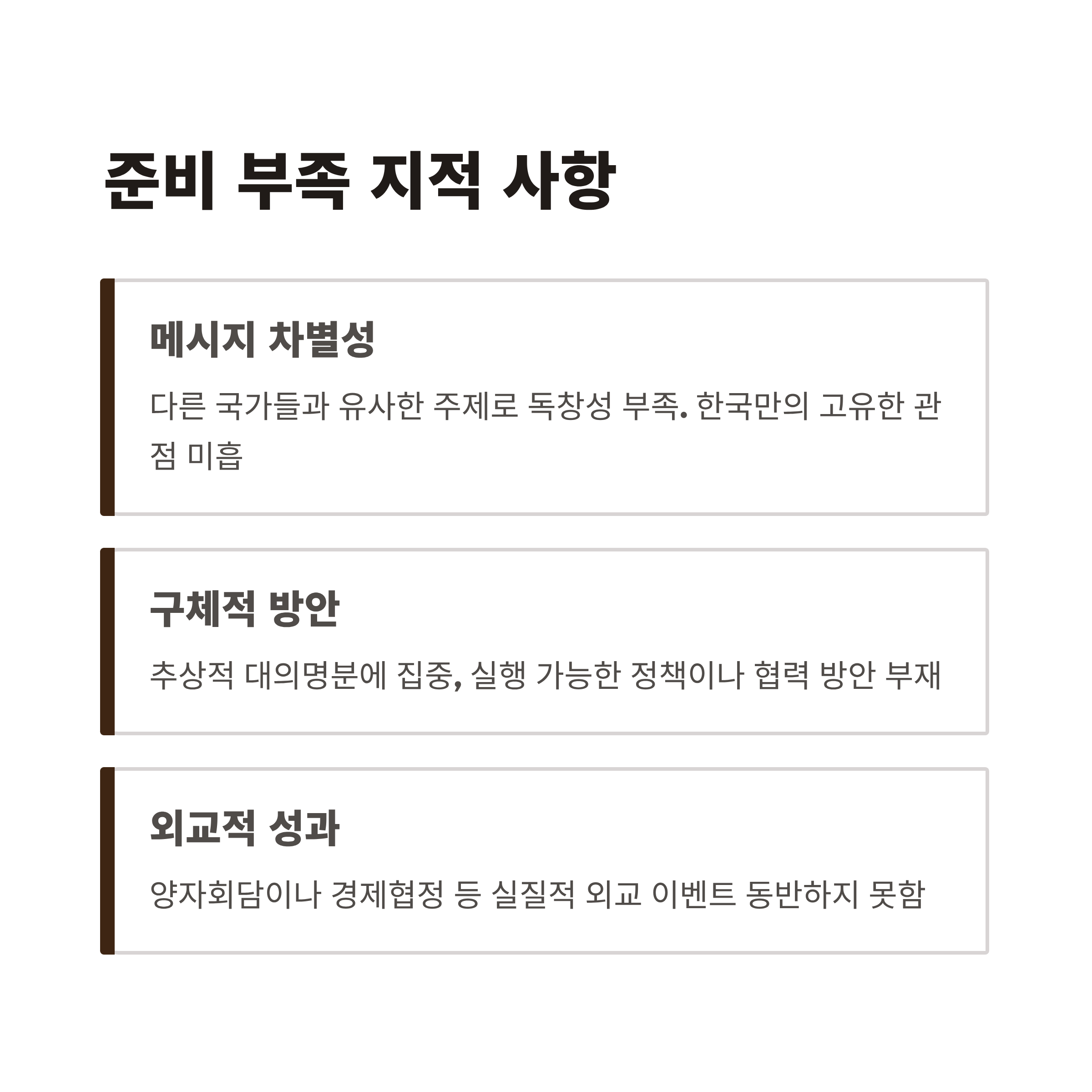 - 국내외에서는 준비 부족이라는 지적과 함께 구체적이고 차별화된 메시지 부재가 언급되었습니다.