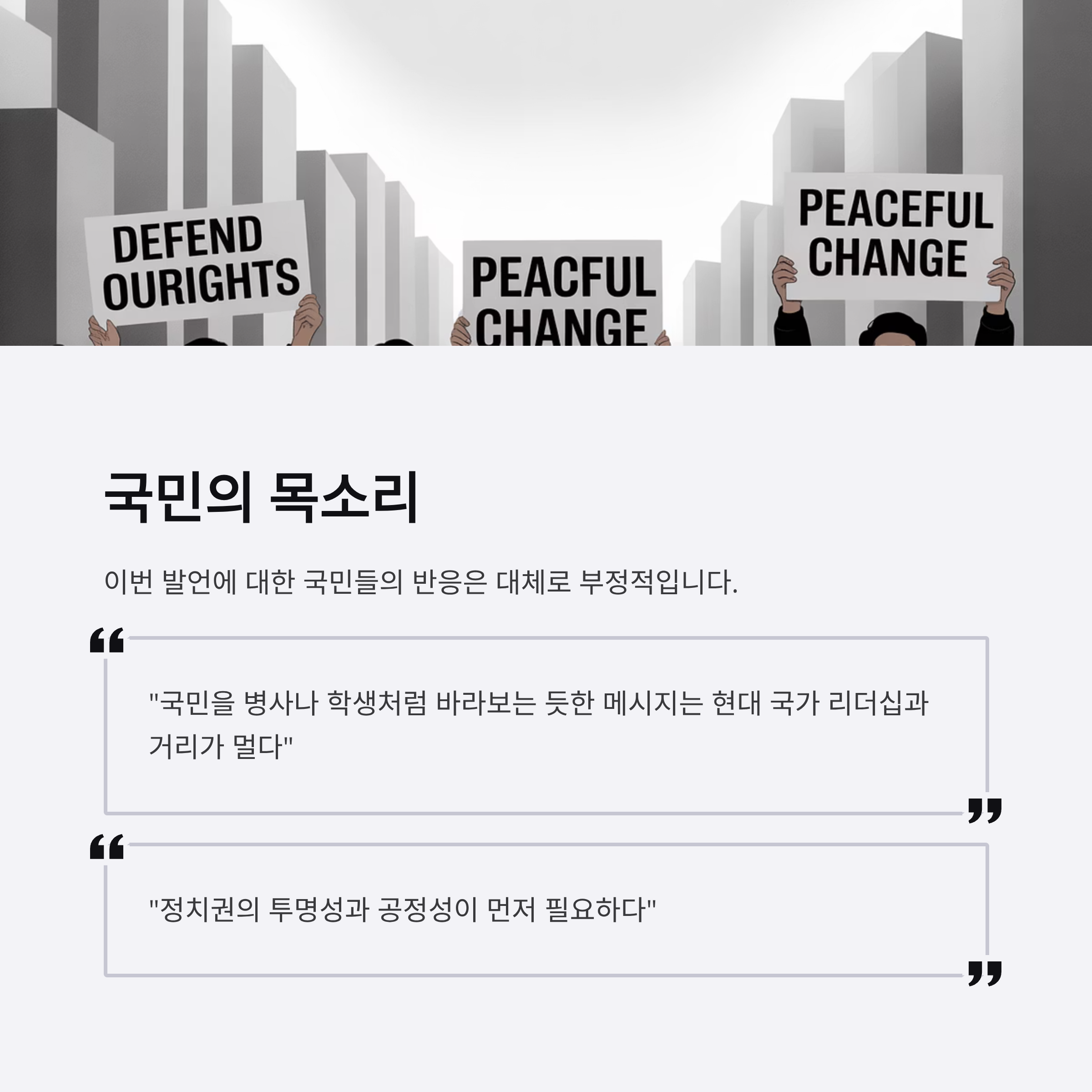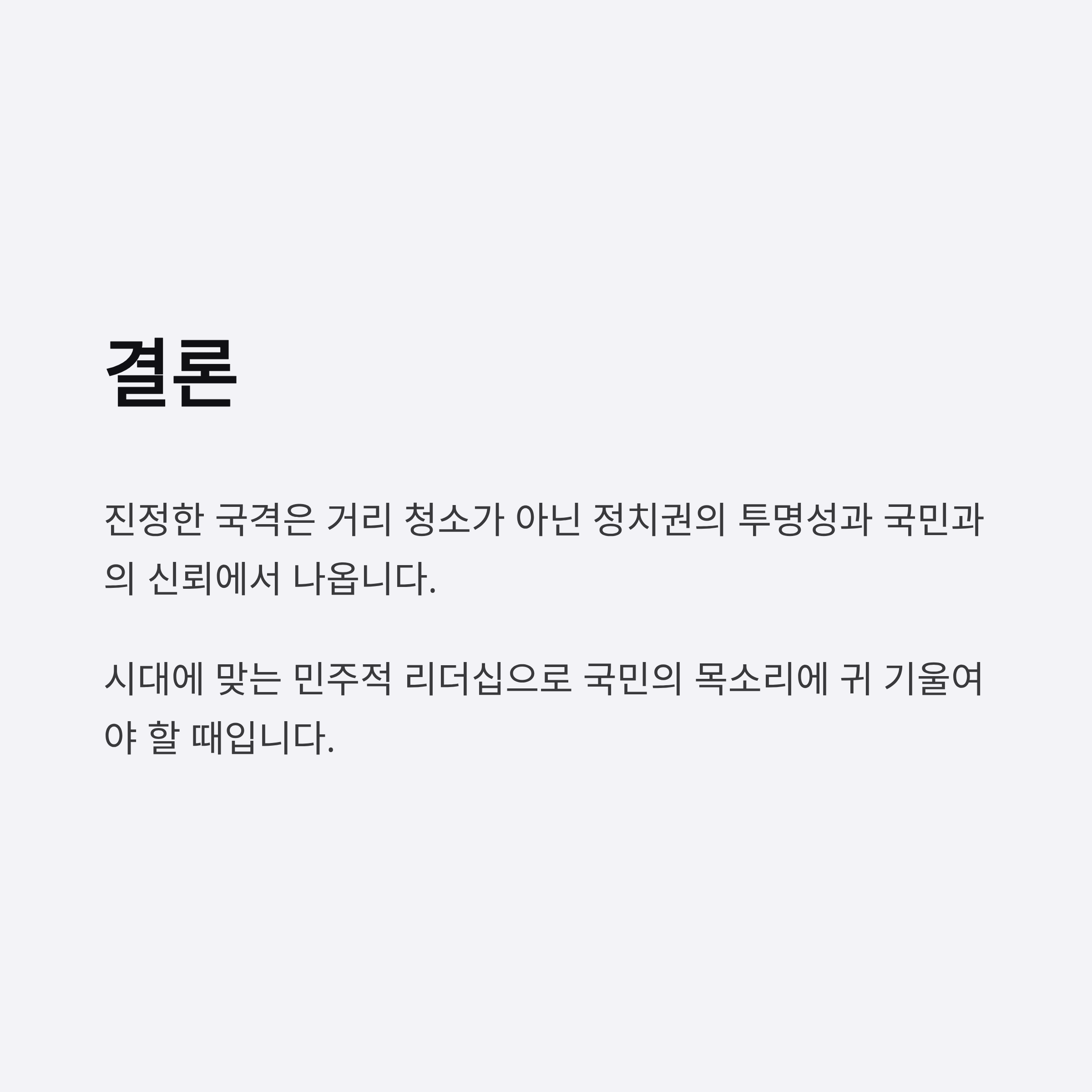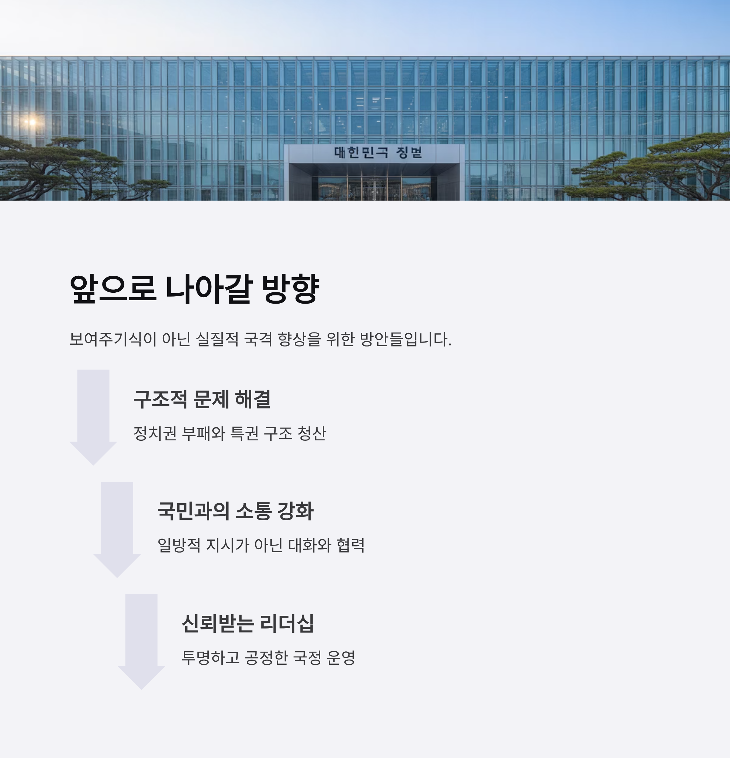 - 국격 향상은 외형이 아닌 투명성, 신뢰, 공정성을 바탕으로 이루어져야 한다는 방향성이 제시되고 있습니다.