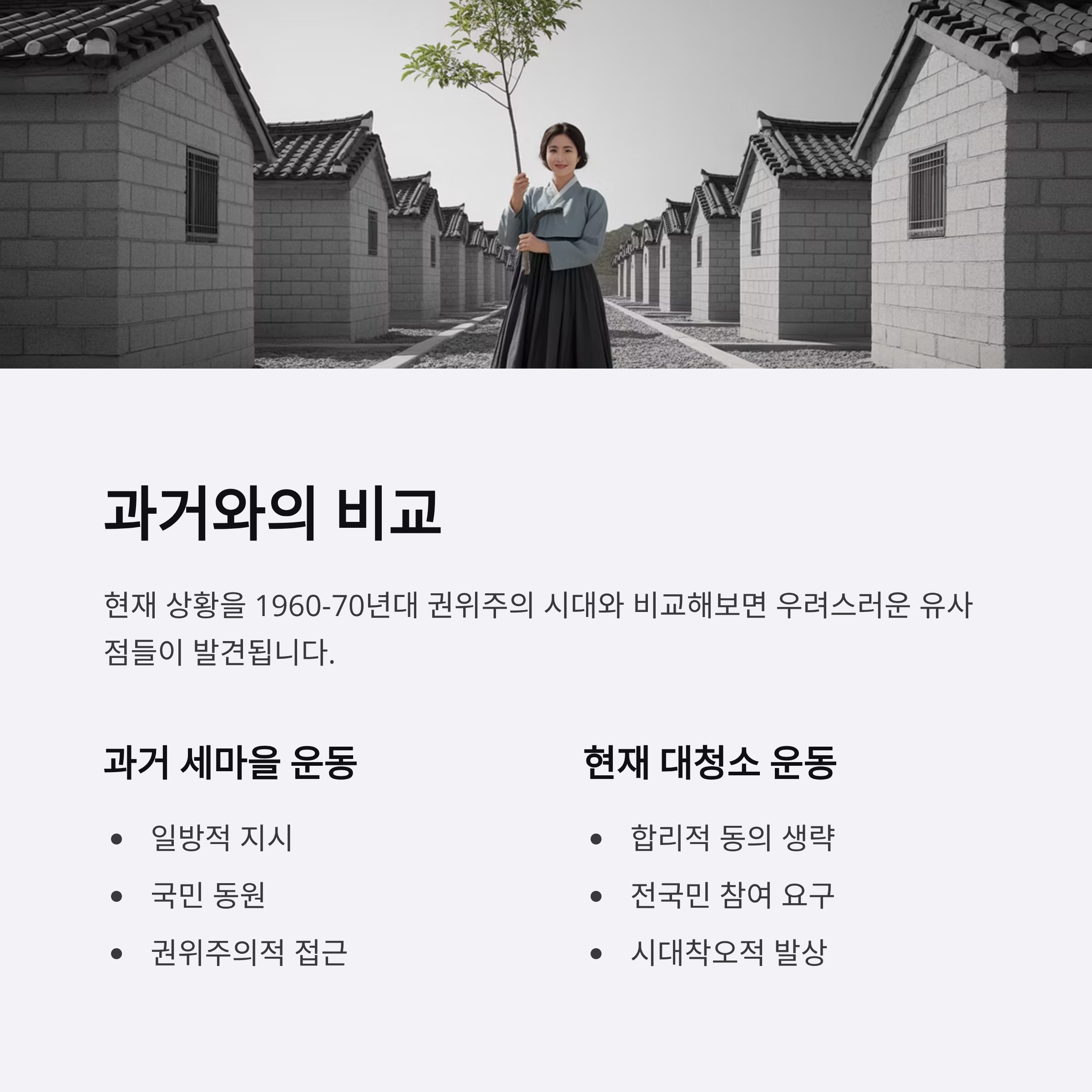 | A. 국민 동원을 강조하며 개인 주체성을 간과한 방식과, 과거 권위주의 시대를 연상시키는 동원적 정책 형태가 논란의 원인으로 작용했습니다. |