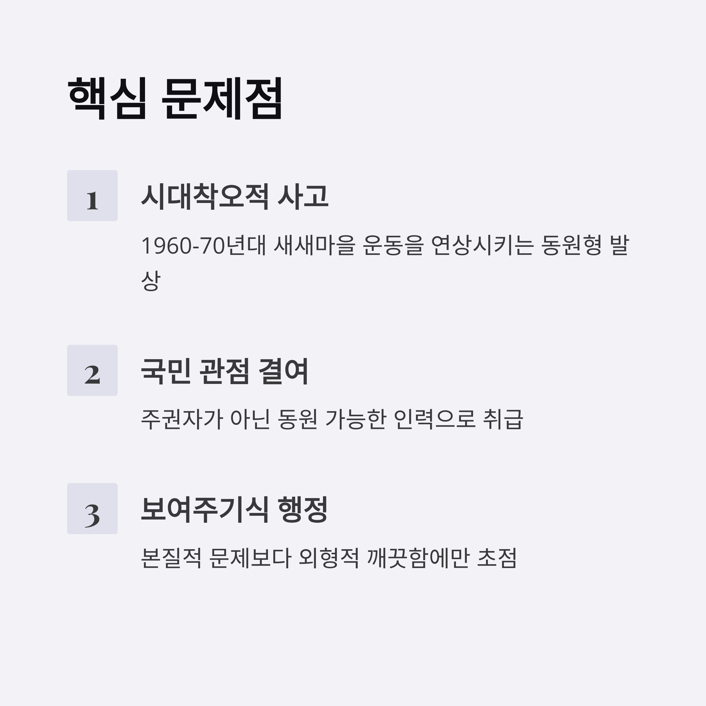 - 국격과 환경미화를 강조했지만, 권위주의 시대의 동원형 행보로 비춰졌다는 비판이 일고 있습니다.