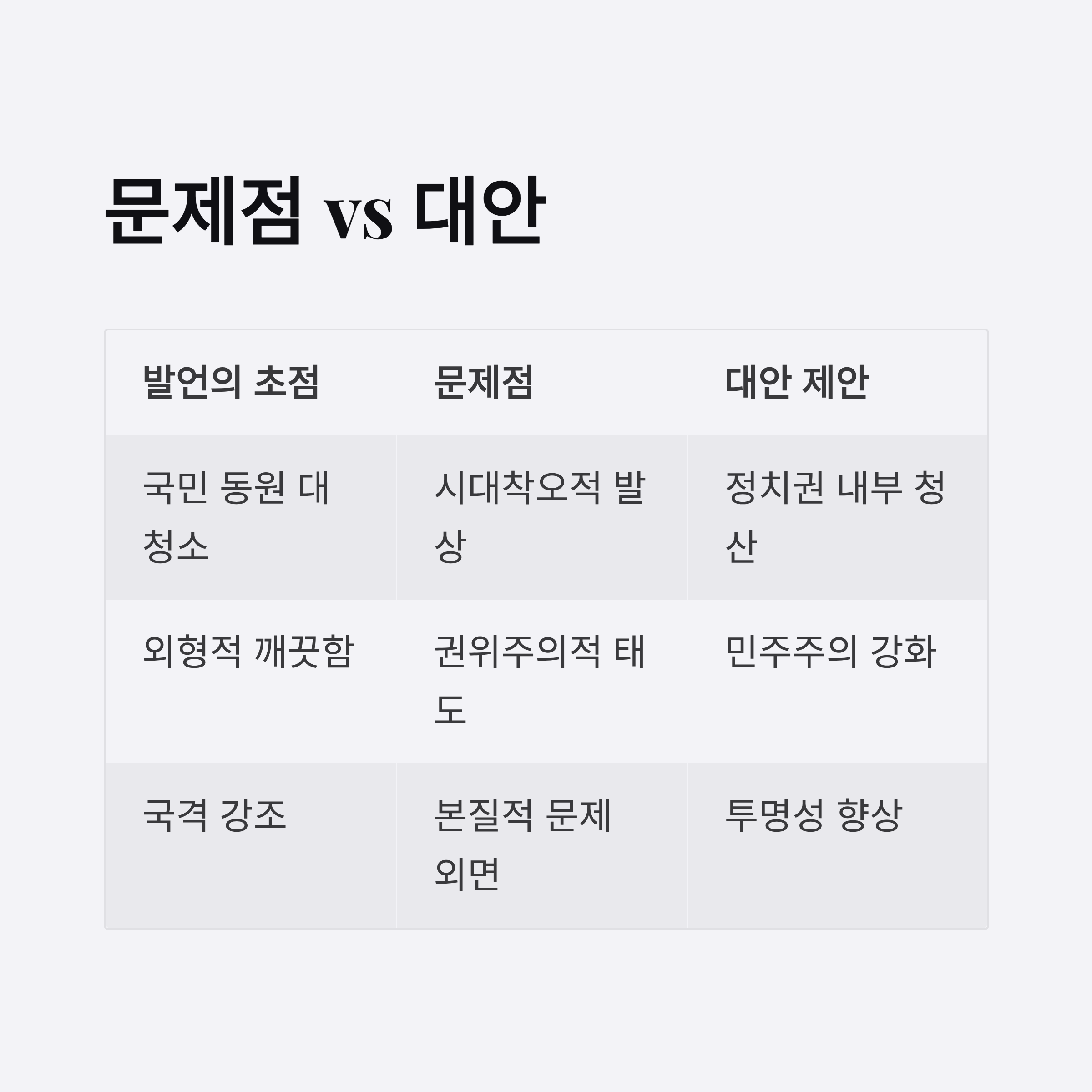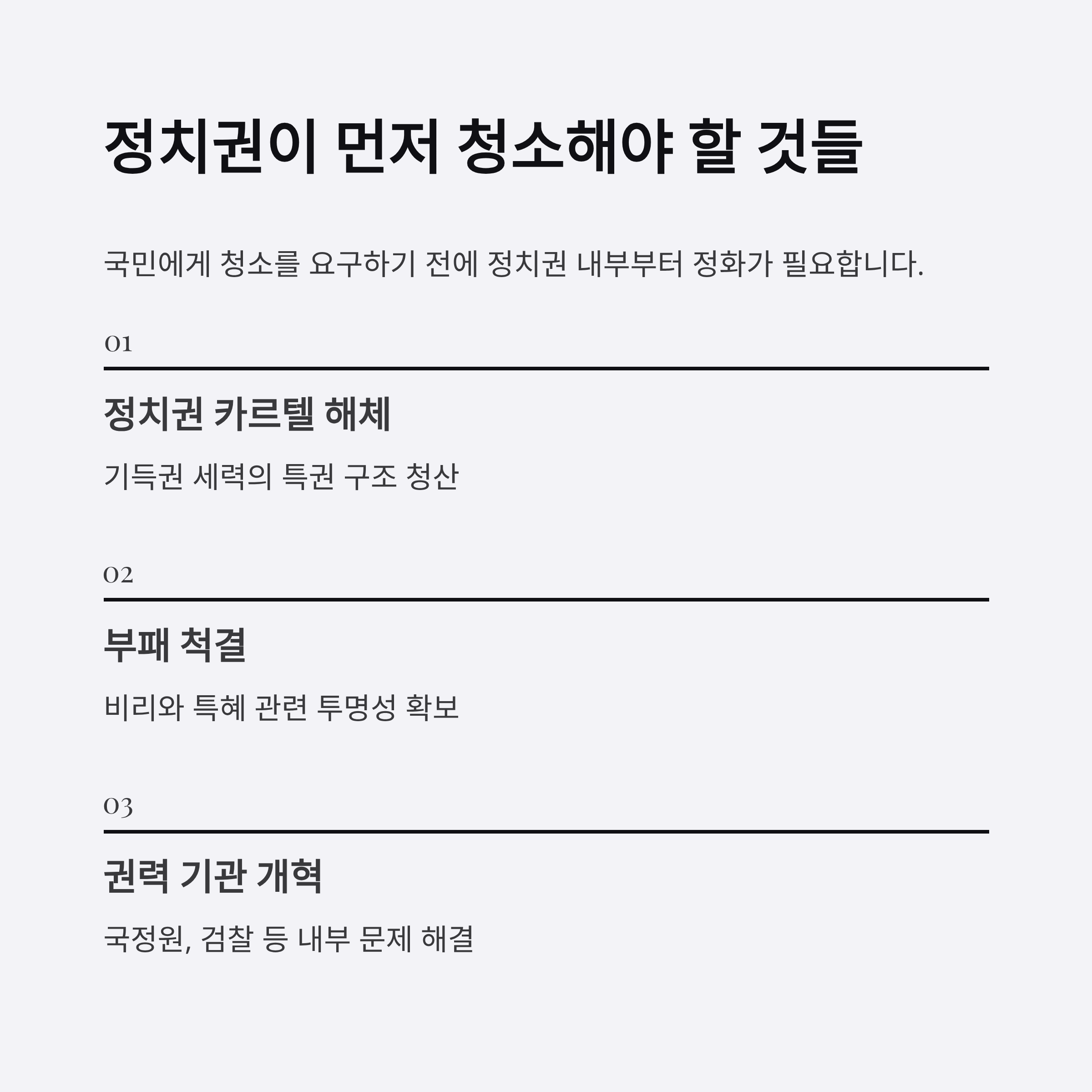 - 청소보다 중요한 것은 공직사회 내부 개혁 및 신뢰 회복이라는 지적이 많습니다.