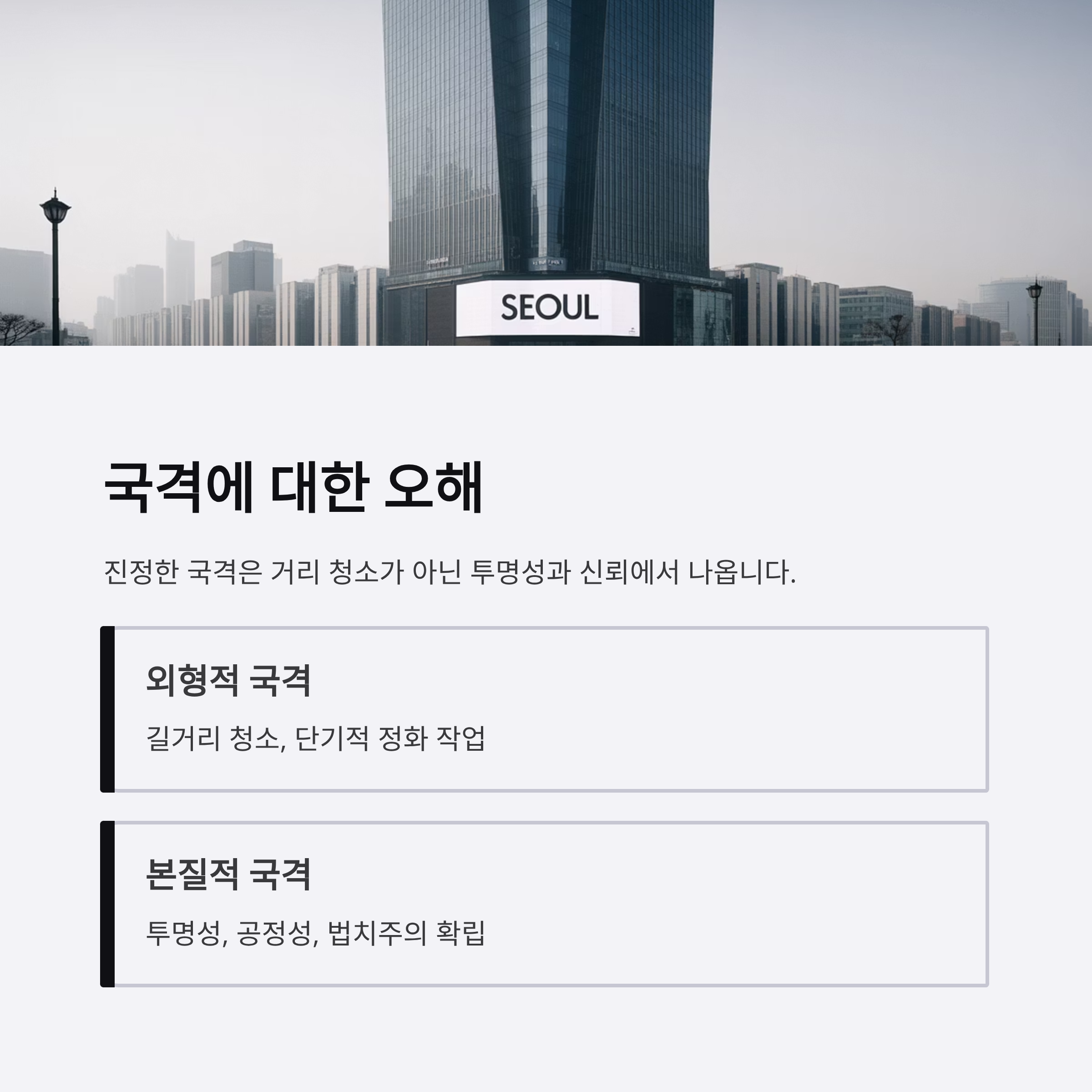 | A. 아닙니다. 국격은 단순히 외형적인 깨끗함이 아니라, 사회적 신뢰, 법적 투명성과 책임 있는 리더십에서 비롯됩니다. |