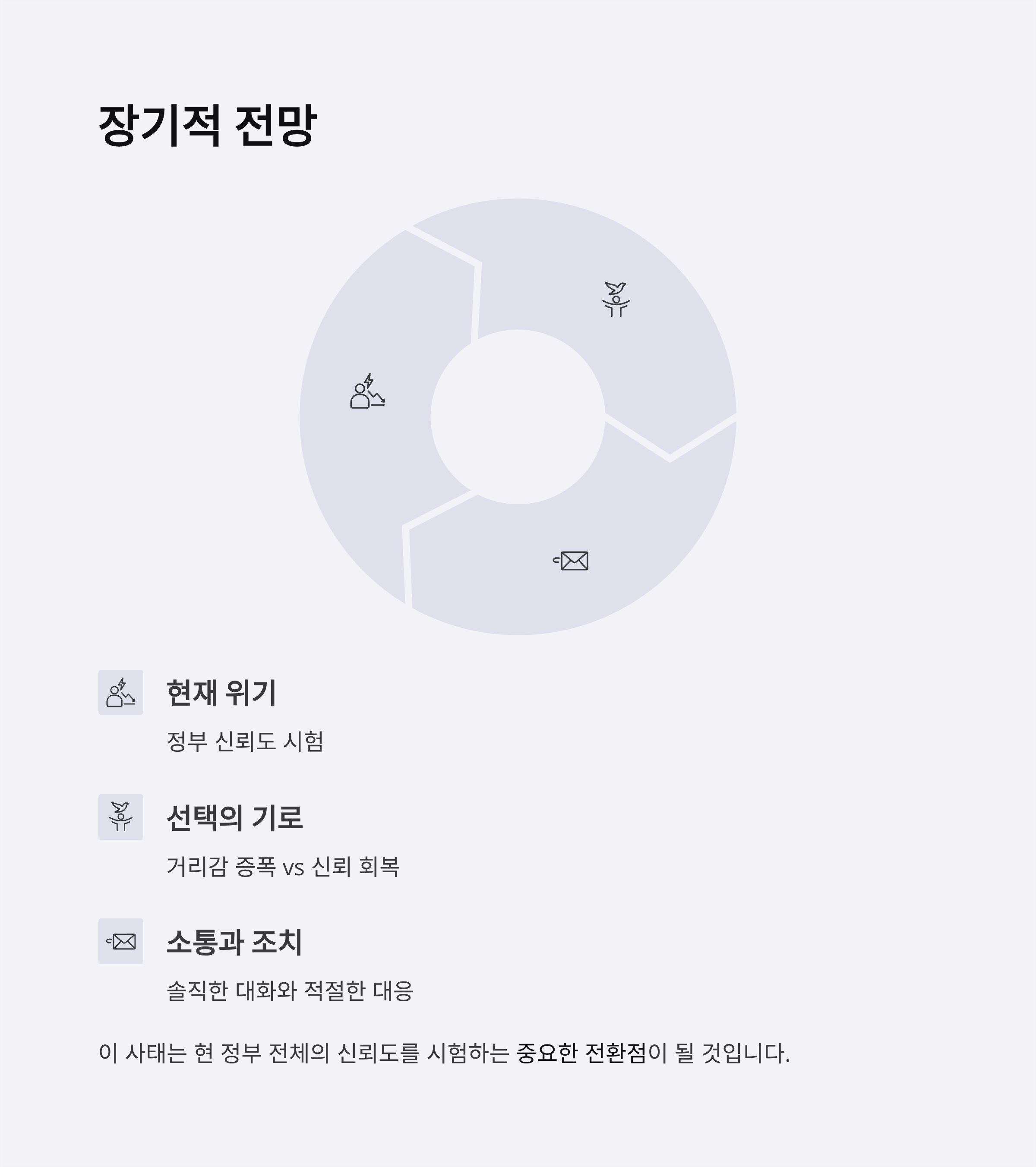 강유정 대변인의 강경 대응은 논란을 진화하기보다는 오히려 확대시키는 결과를 초래했다. 특히, 제기된 은폐 의혹과 관련하여 정확한 사실을 밝히기 위한 노력이 아닌, 비판적인 목소리를 향해 법적 조치를 경고한 것은 결과적으로 정부의 투명성을 해칠 수 있는 태도로 받아들여졌다. 정치권에서는 야당뿐 아니라 일부 여당 내 일부 의원들조차 조심스럽게 문제를 제기하며 대통령 리더십에 대한 성찰을 요구하고 있다. 이는 일부 이슈가 국민들에게 정치적 신뢰를 잃는 결과로 이어질 수 있음을 보여준다.