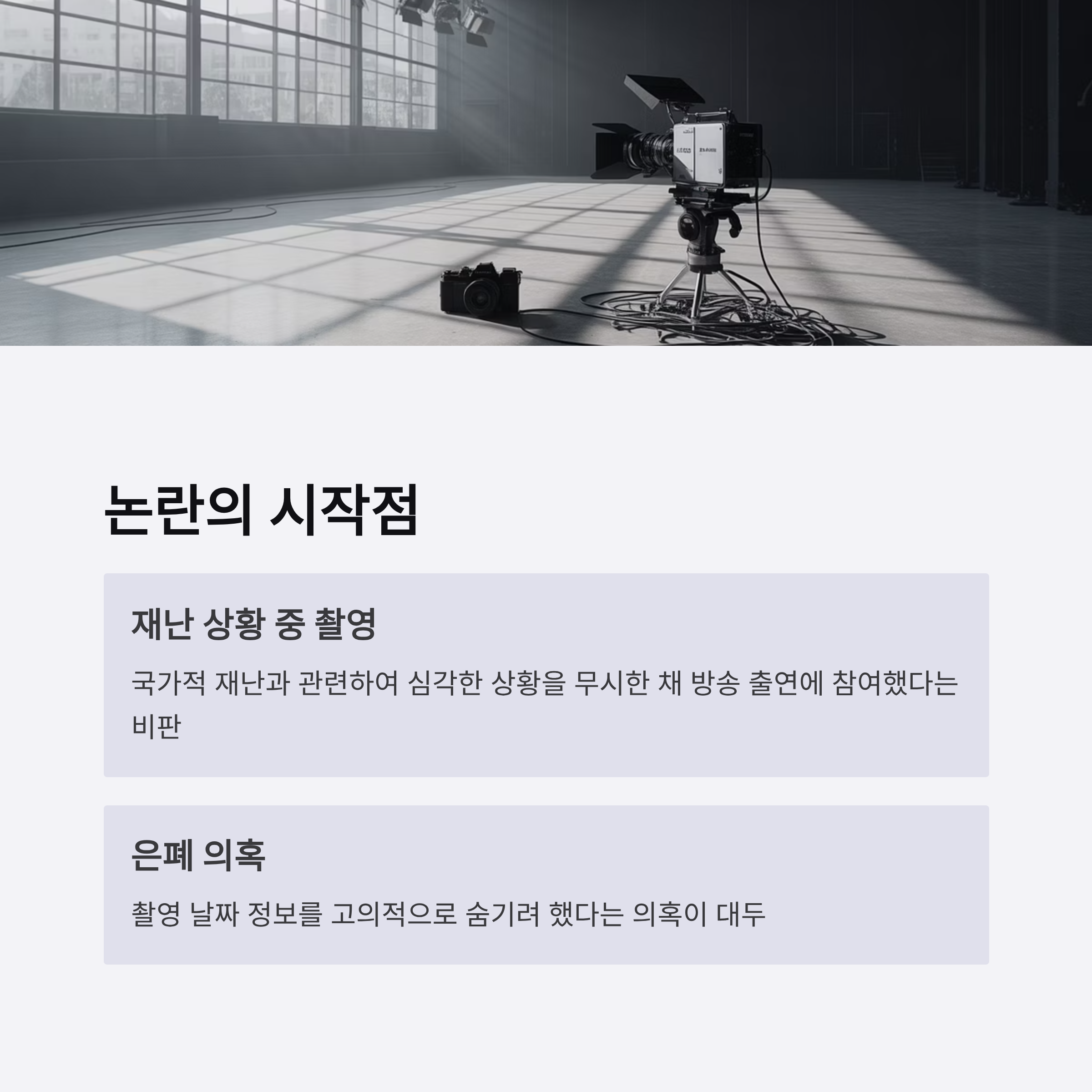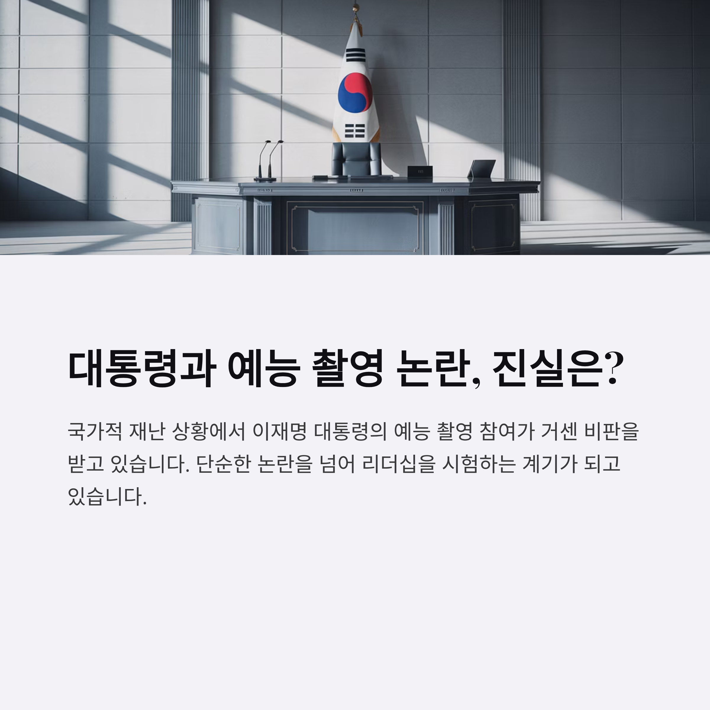 국가적 재난 상황 속에서의 예능 촬영이라는 대통령의 행동이 현재 대한민국에서 가장 논쟁적인 화두로 떠오르고 있습니다. 이 사건은 다음과 같은 내용으로 요약될 수 있습니다.