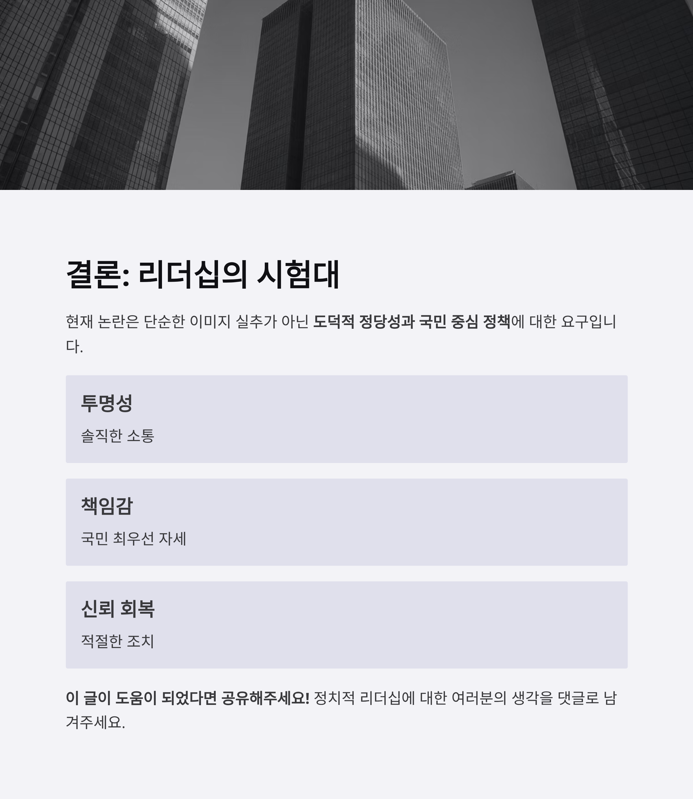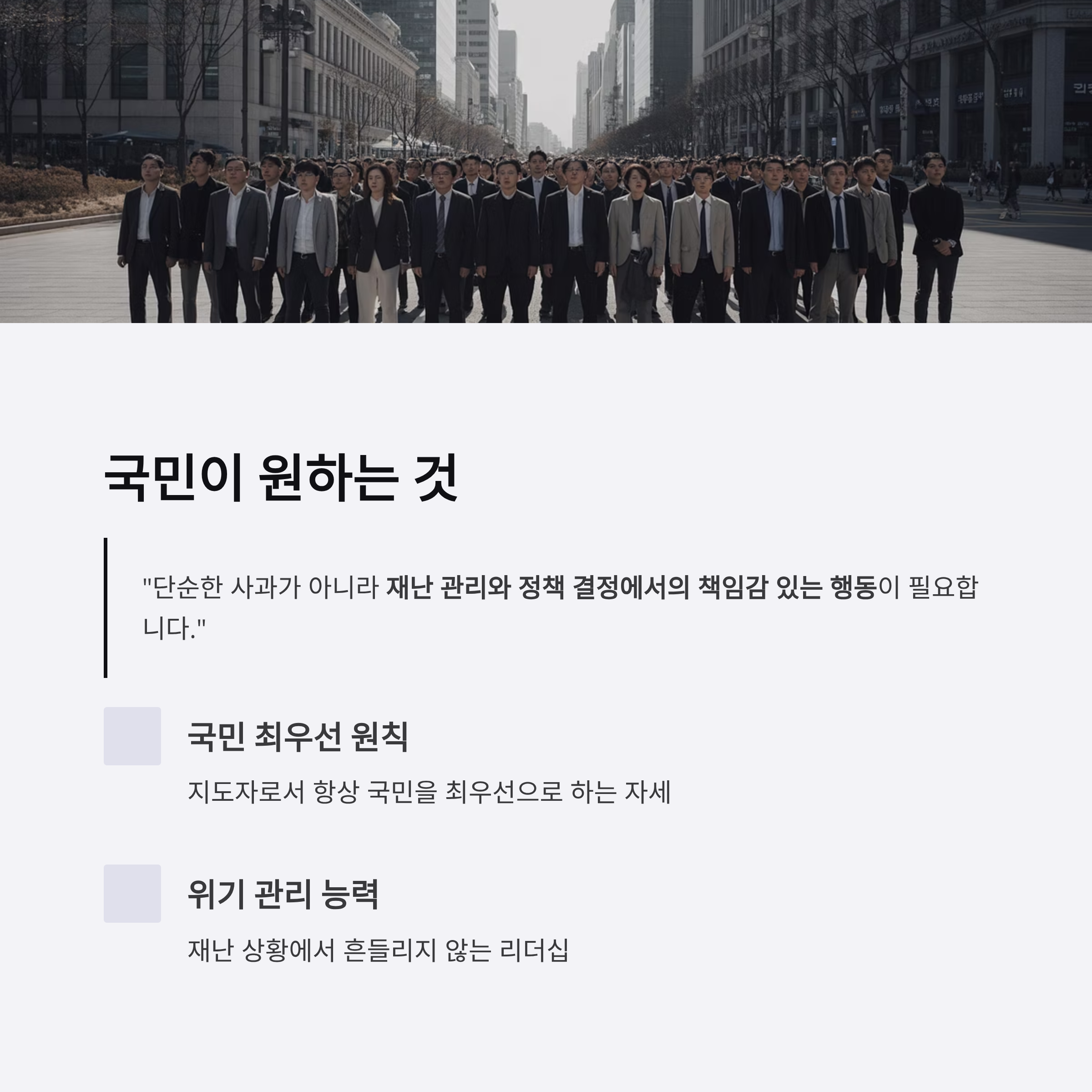 논란을 잠재우기 위해 가장 중요한 점은 국민과의 소통과 신뢰 회복이다. 이재명 대통령은 지금부터라도 정직한 태도로 사건의 전말을 해명하고, 실수를 인정하며 앞으로의 리더십 방향성을 명확히 해야 한다. 또한, 국민이 원하는 것은 단순한 사과가 아니라, 재난 관리와 정책 결정에서의 책임감 있는 행동이다. 이 점이 부각되지 않는 한, 논란은 쉽게 가라앉지 않을 것이다. 지도자로서의 중심은 항상 국민을 최우선으로 하는 데 있음을 상기해야 할 시점이다.