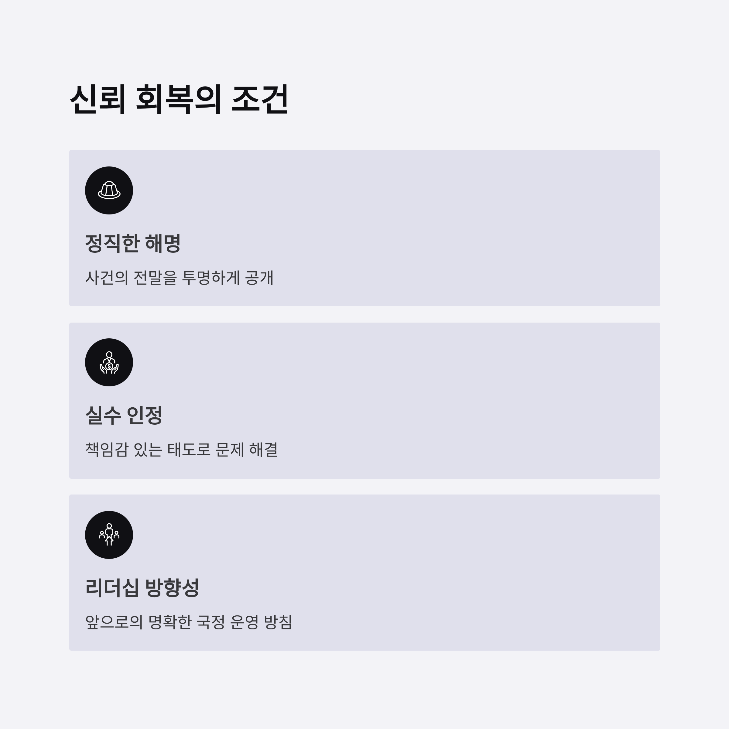 현재 이재명 대통령의 예능 촬영 논란은 단순한 이미지 실추 문제가 아니다. 국민은 지도자에게 도덕적 정당성과 국민 중심의 정책 방향을 요구하고 있다. 리더가 보여줄 필요가 있는 것은 투명성과 소통뿐만 아니라 재난 속에서도 흔들리지 않는 자세이다. 이 사태는 대통령 개인뿐만 아니라 현 정부 전체의 신뢰도를 시험하는 순간이다. 장기적으로 이러한 논란은 국민과 정부 간의 거리감을 증폭시키거나, 반대로 솔직한 소통과 적절한 조치로 신뢰를 회복하는 전환점이 될 수도 있다.
