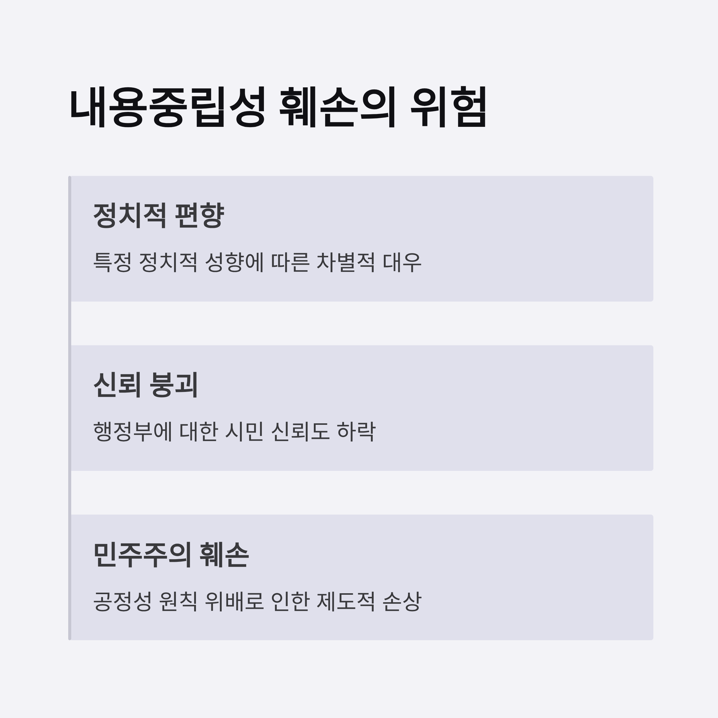 | A. 동일한 조건에서 특정 의견만 배제하면 내용중립성 위반이 됩니다. 행정은 공개된 TPM 기준으로 일관되게 적용해야 합니다. |