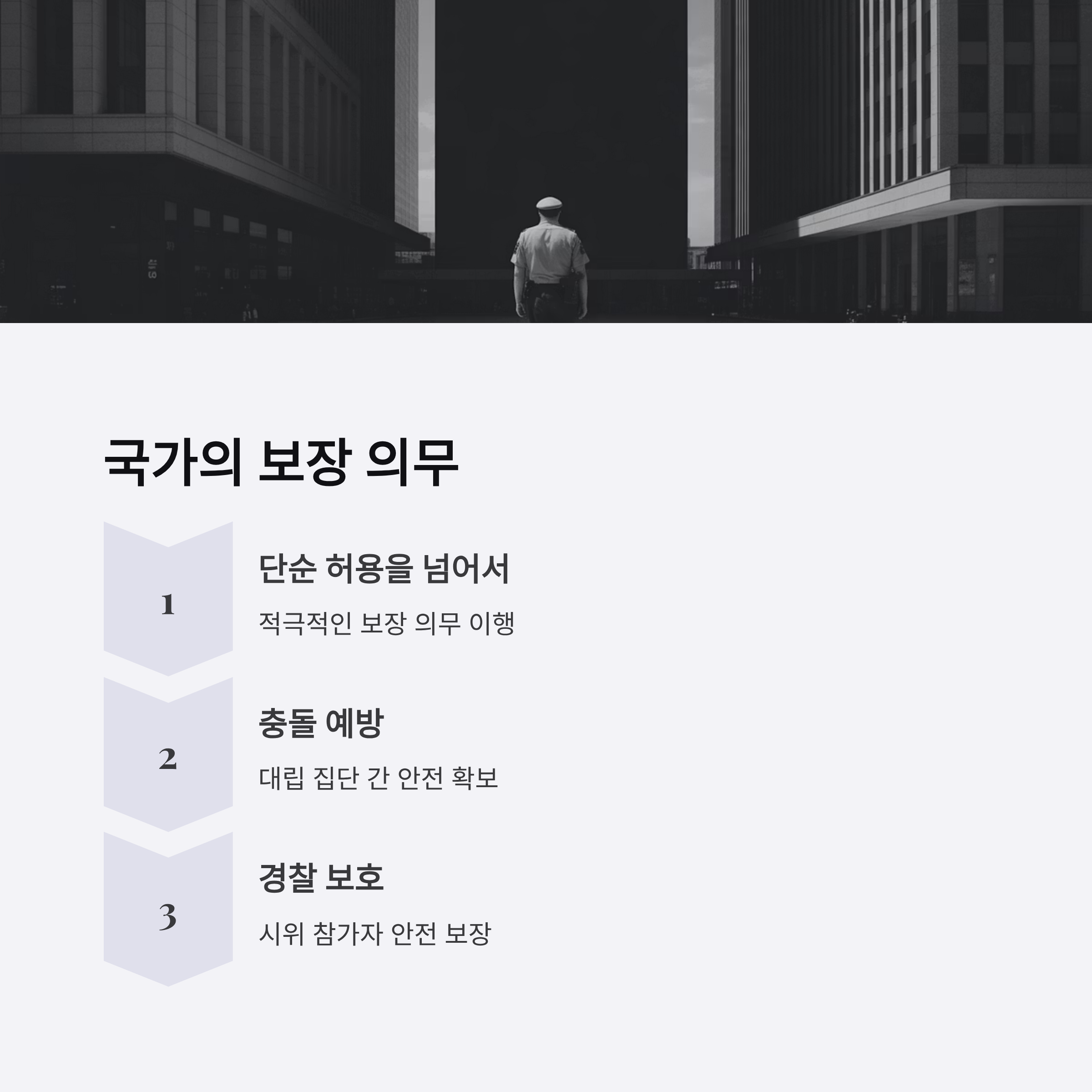 - 보장 의무: 국가는 단순 허용을 넘어 충돌 예방·경찰 보호 등 실질적 보장을 제공해야 함.