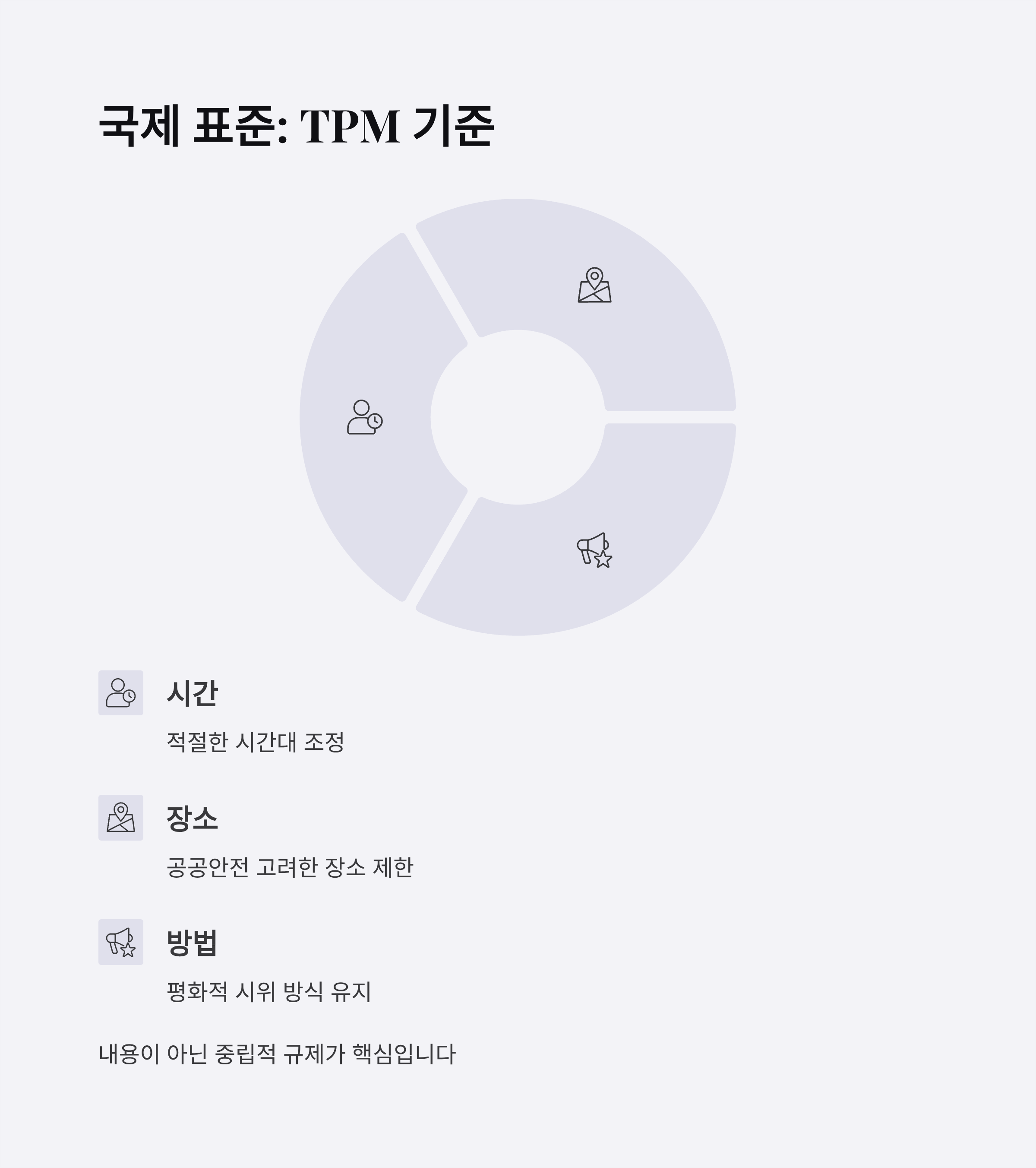 민주국가의 규제 기준은 내용이 아닌 시간·장소·방법(TPM)입니다. 예컨대 병원 주변 소음 제한, 심야 확성기 규제, 경로 충돌 방지를 위한 조정 등입니다. 이는 표현의 핵심을 지키면서 위험을 줄이는 방식입니다. 유럽인권재판소와 베니스위원회도 국가는 단순 허용을 넘어 실질적 보장 의무를 지닌다고 판시했습니다. 결국 핵심 시험대는 내용중립성입니다.
