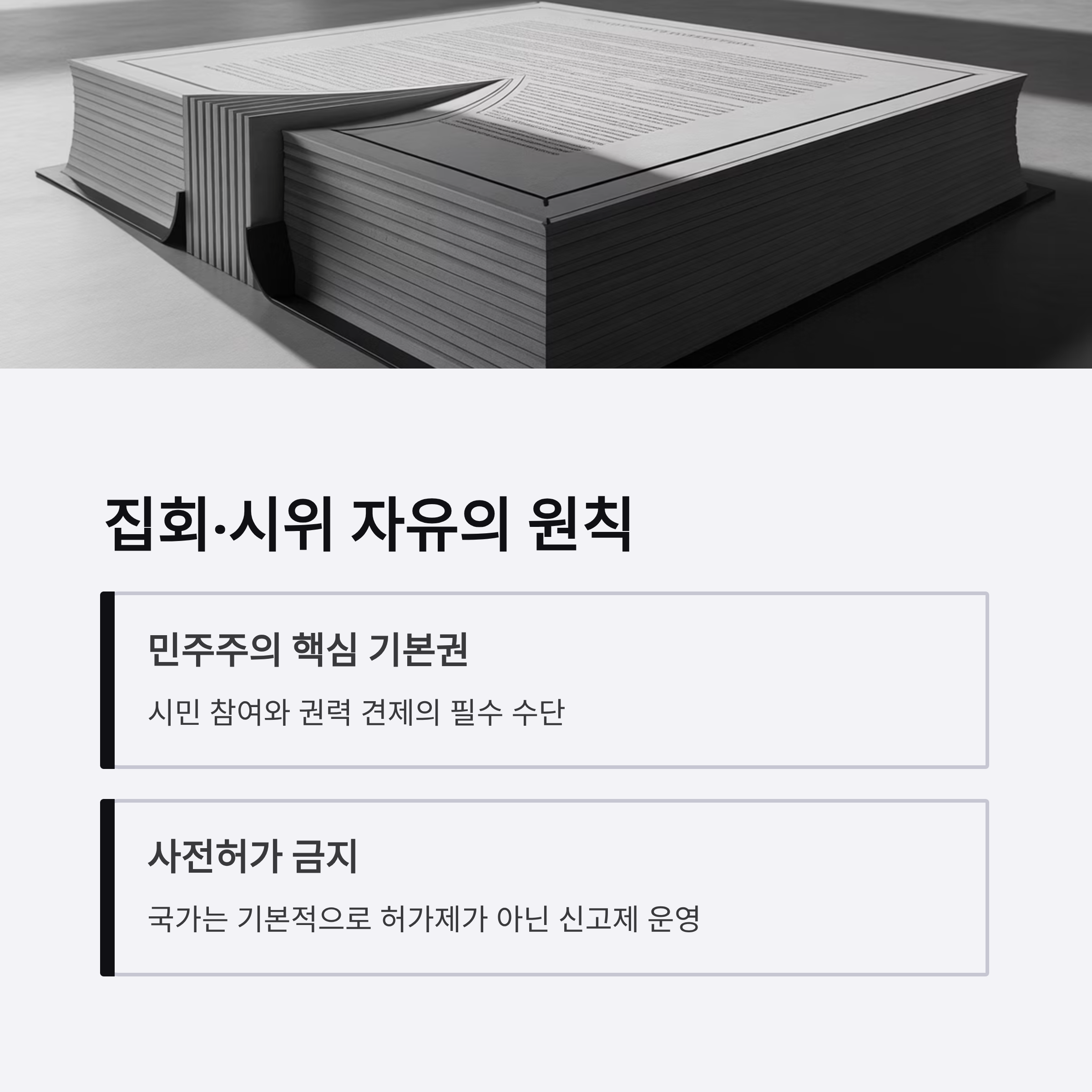 - 원칙: 집회·시위의 자유는 민주주의 핵심 기본권이며, 사전허가 금지는 국가의 기본 입장.