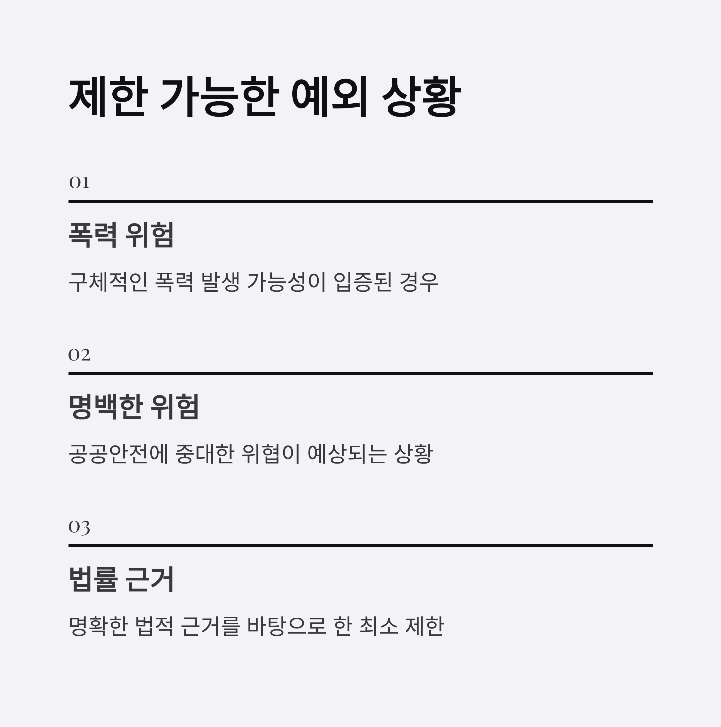 - 예외: 폭력·명백한 위험·중대한 공공안전 침해가 구체적으로 입증될 때 법률 근거로 최소 제한 가능.