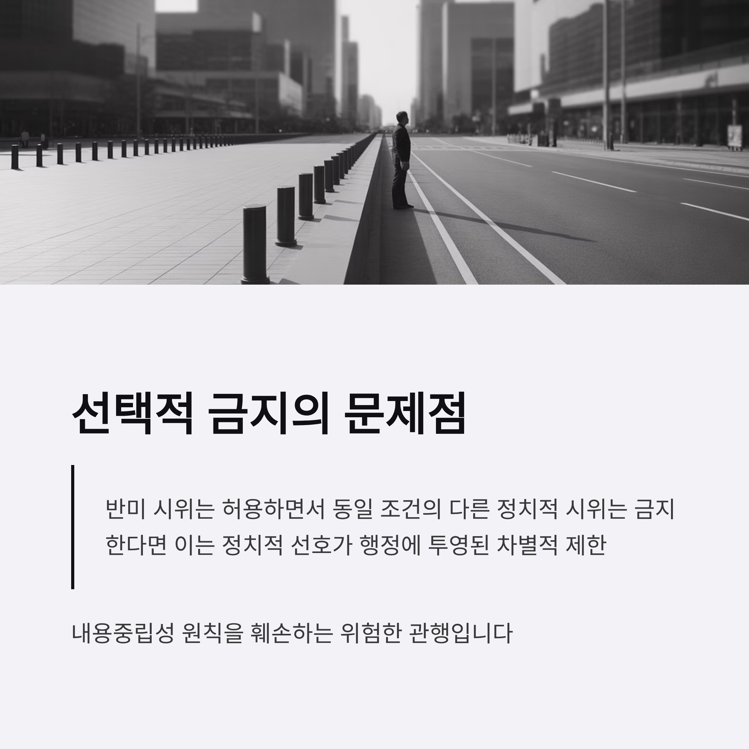 - 선택적 금지의 모순: 반미 시위는 되고 다른 시위는 왜 안 되나
