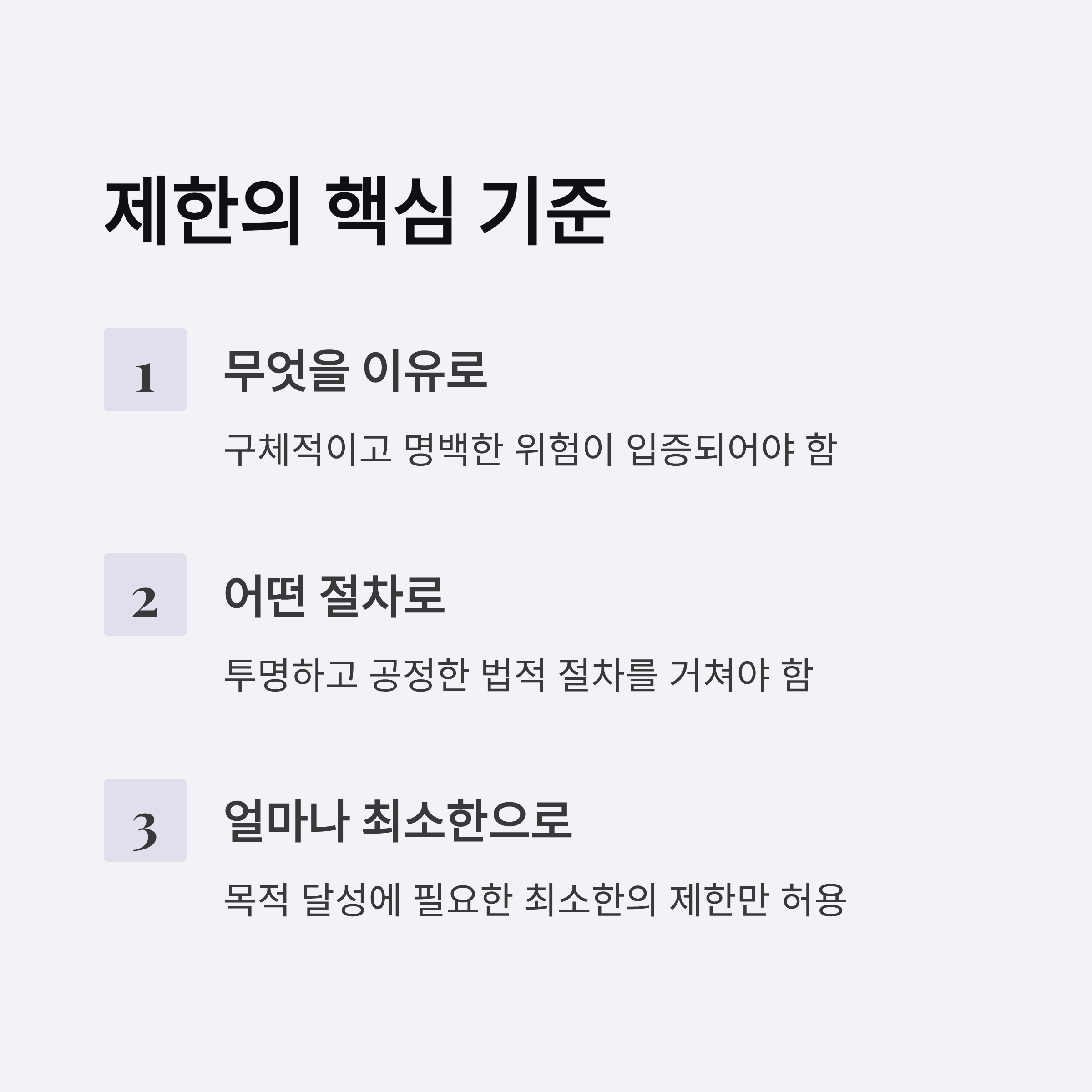 - 기준선: 헌법·국제규범과 ‘시간·장소·방법’ 원칙
