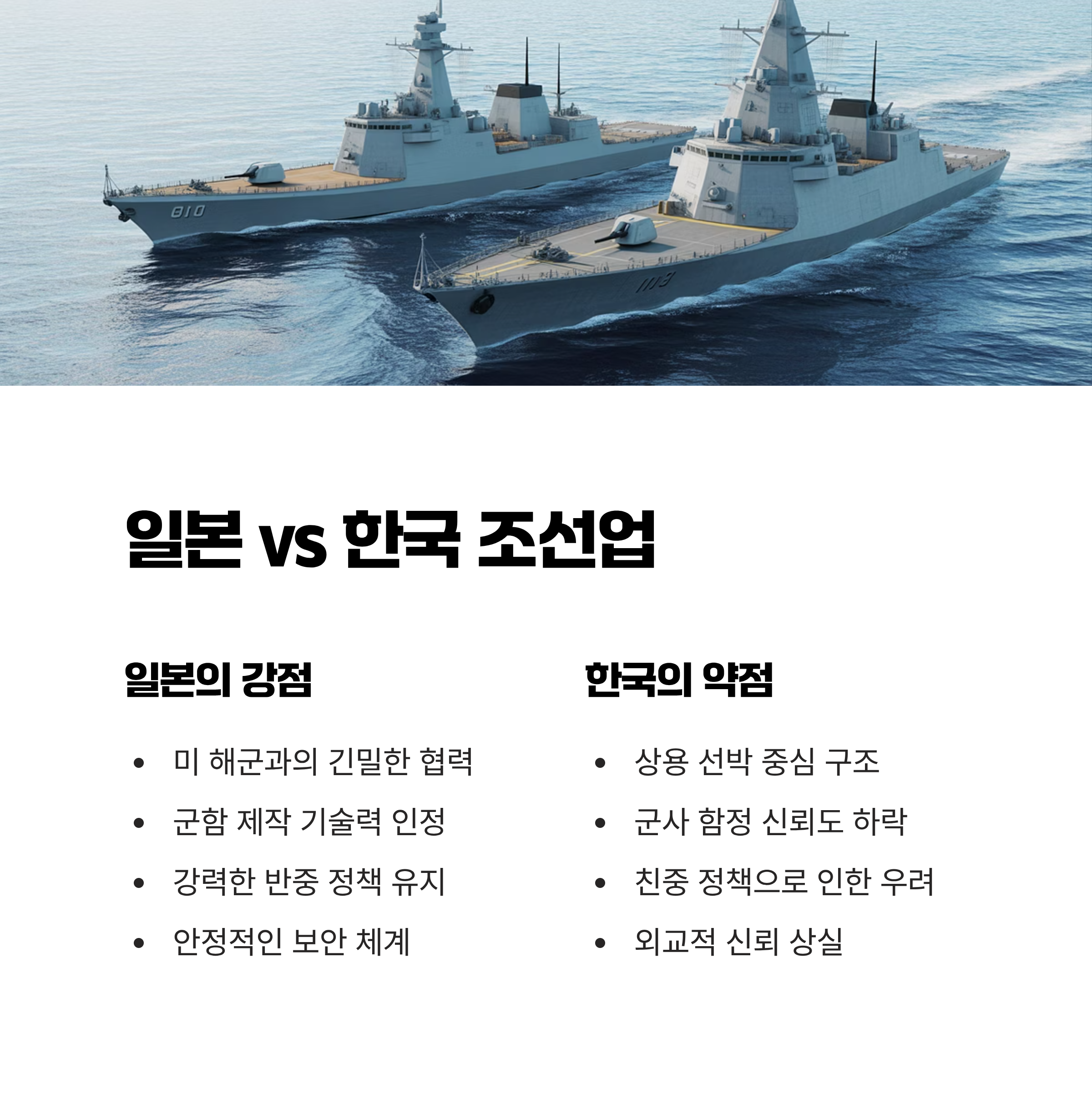| A. 일본은 군사적 신뢰와 기술력으로 조선업의 국제적 경쟁력을 인정받아 왔습니다. 이에 반해, 한국은 최근 친중 행보로 전략적 파트너로서의 신뢰를 잃었습니다. |