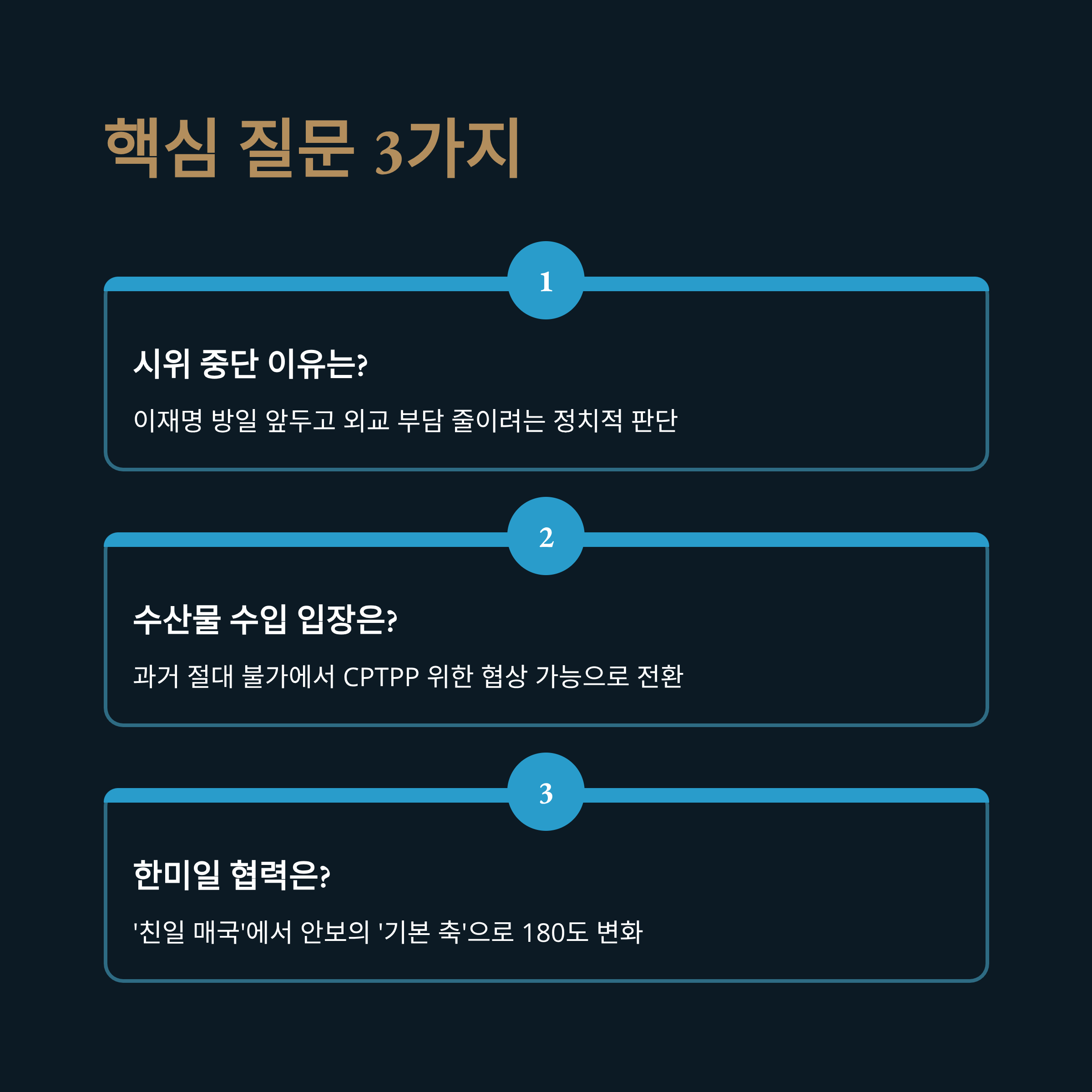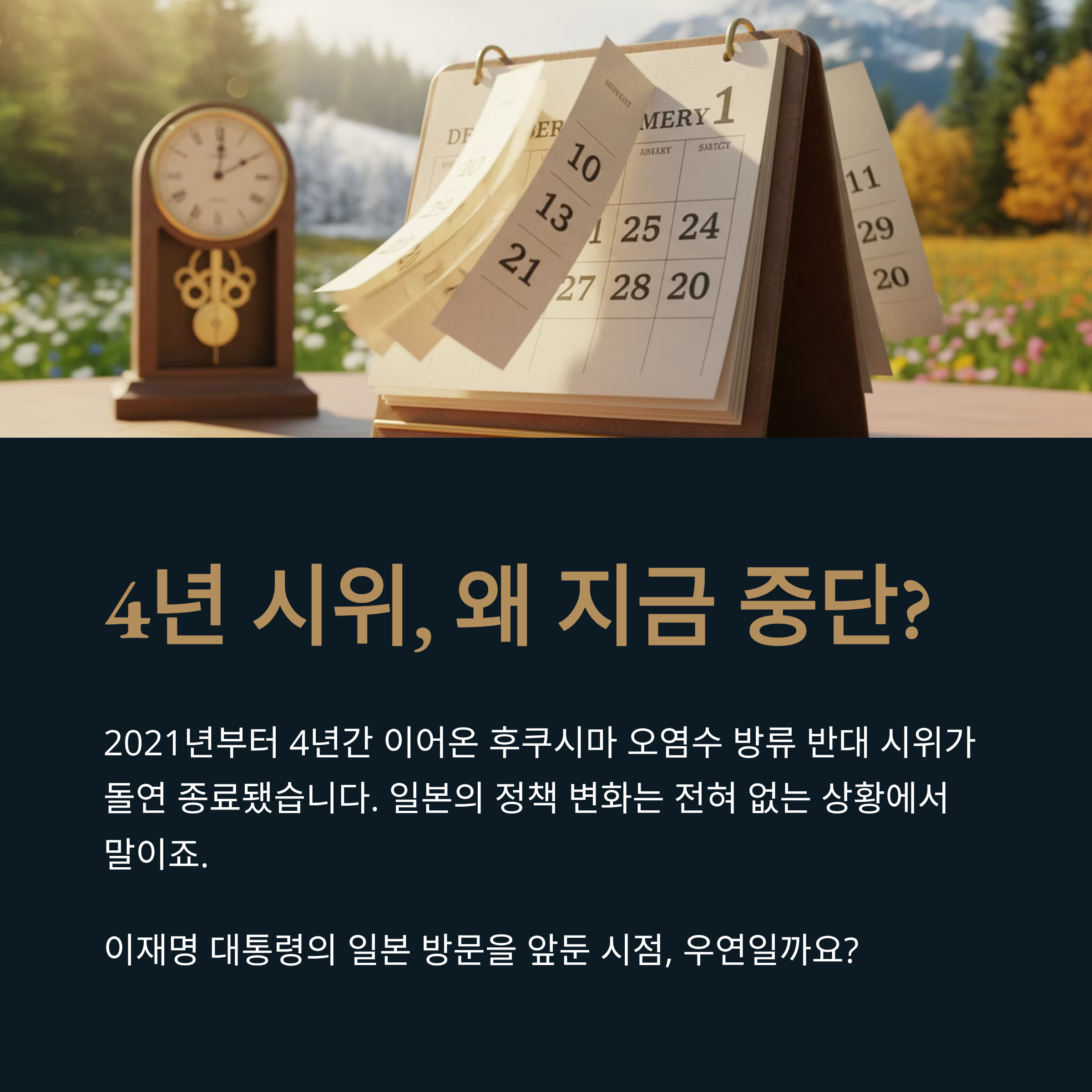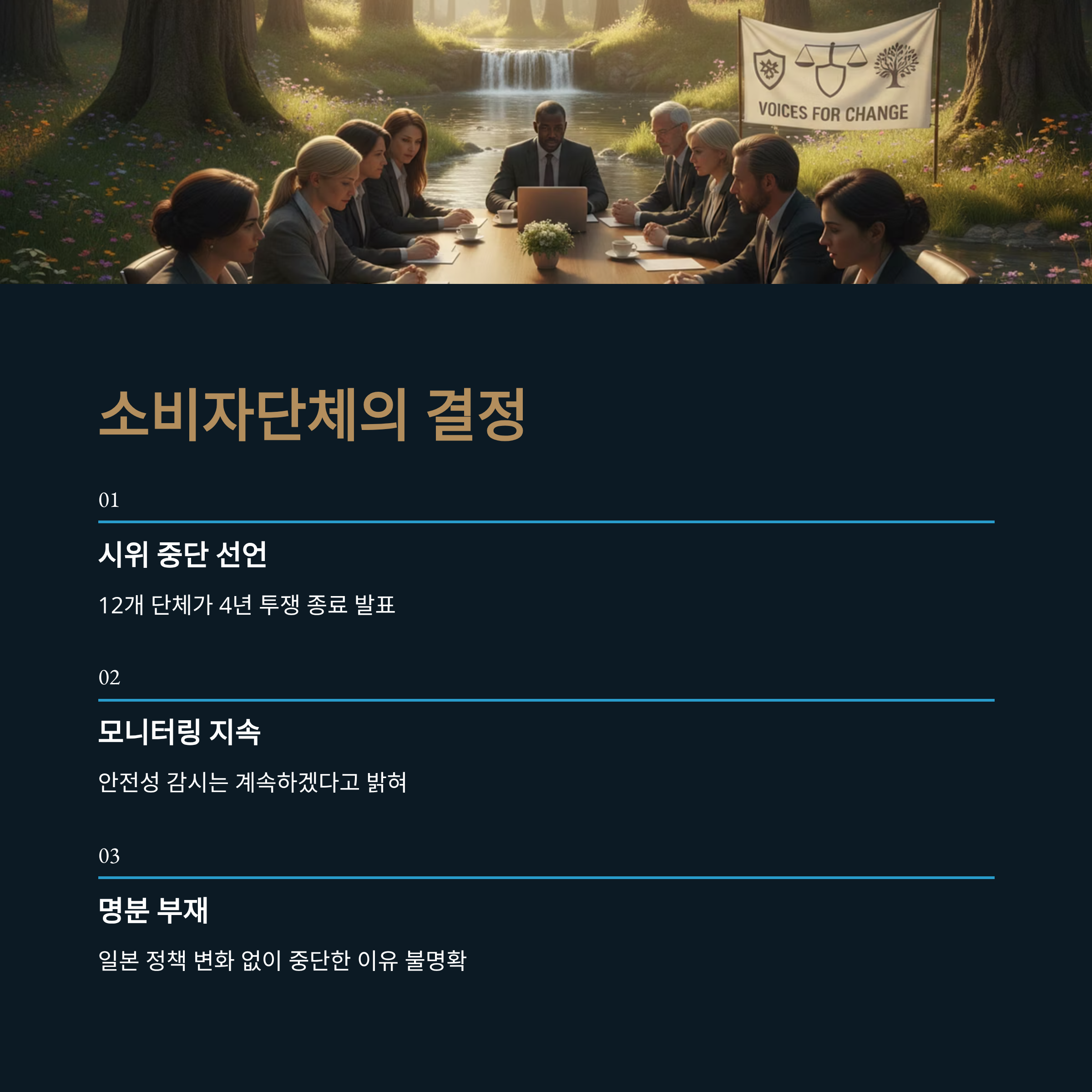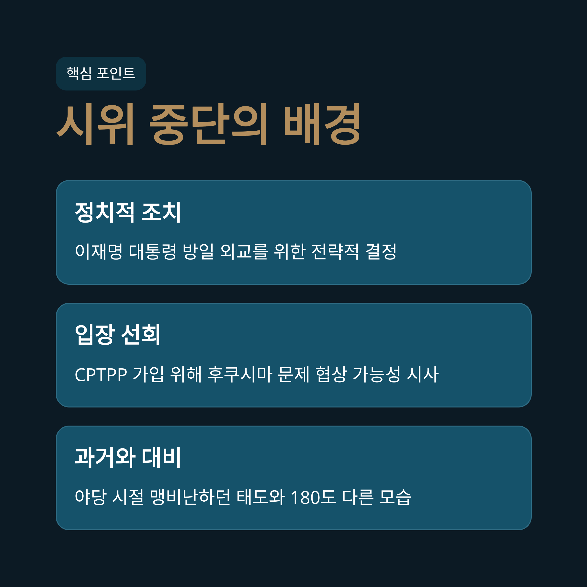 소비자 단체의 후쿠시마 시위 중단은 이재명 대통령의 방일 외교를 위한 정치적 조치라는 해석이 지배적입니다.