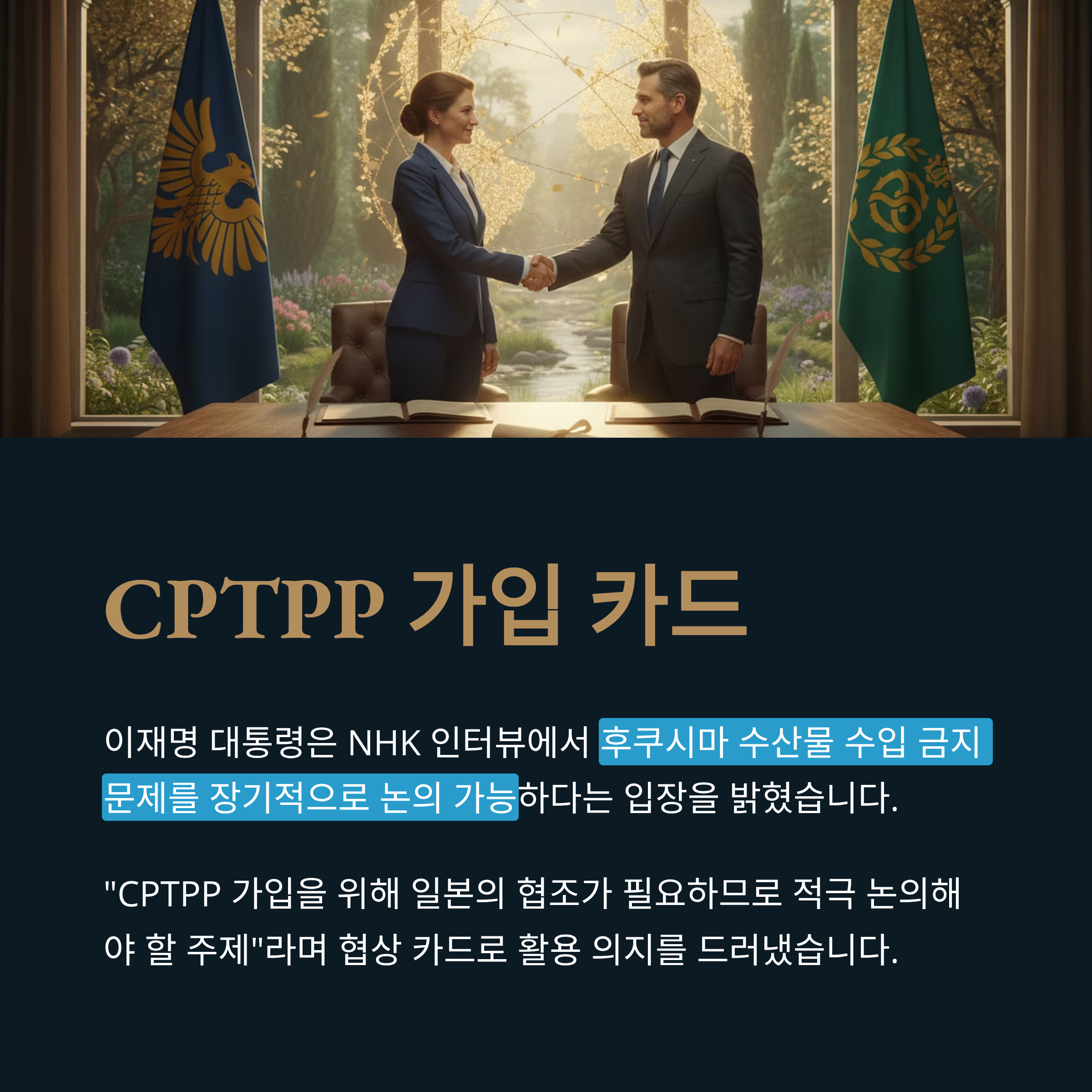 이재명 대통령은 일본 NHK와의 인터뷰에서 CPTPP 가입의 중요성을 강조하며 후쿠시마 수산물 수입 금지 문제에 대해 전향적인 태도를 보였습니다. 그는 "국민 정서와 신뢰 문제로 단기적 해제는 어렵지만, CPTPP 가입을 위해 일본의 협조를 얻어야 하므로 적극적으로 논의해야 할 주제"라고 말했습니다. 이는 사실상 수산물 수입 재개를 협상 카드로 활용할 수 있음을 시사한 발언으로, 과거 입장과는 완전히 배치됩니다.
