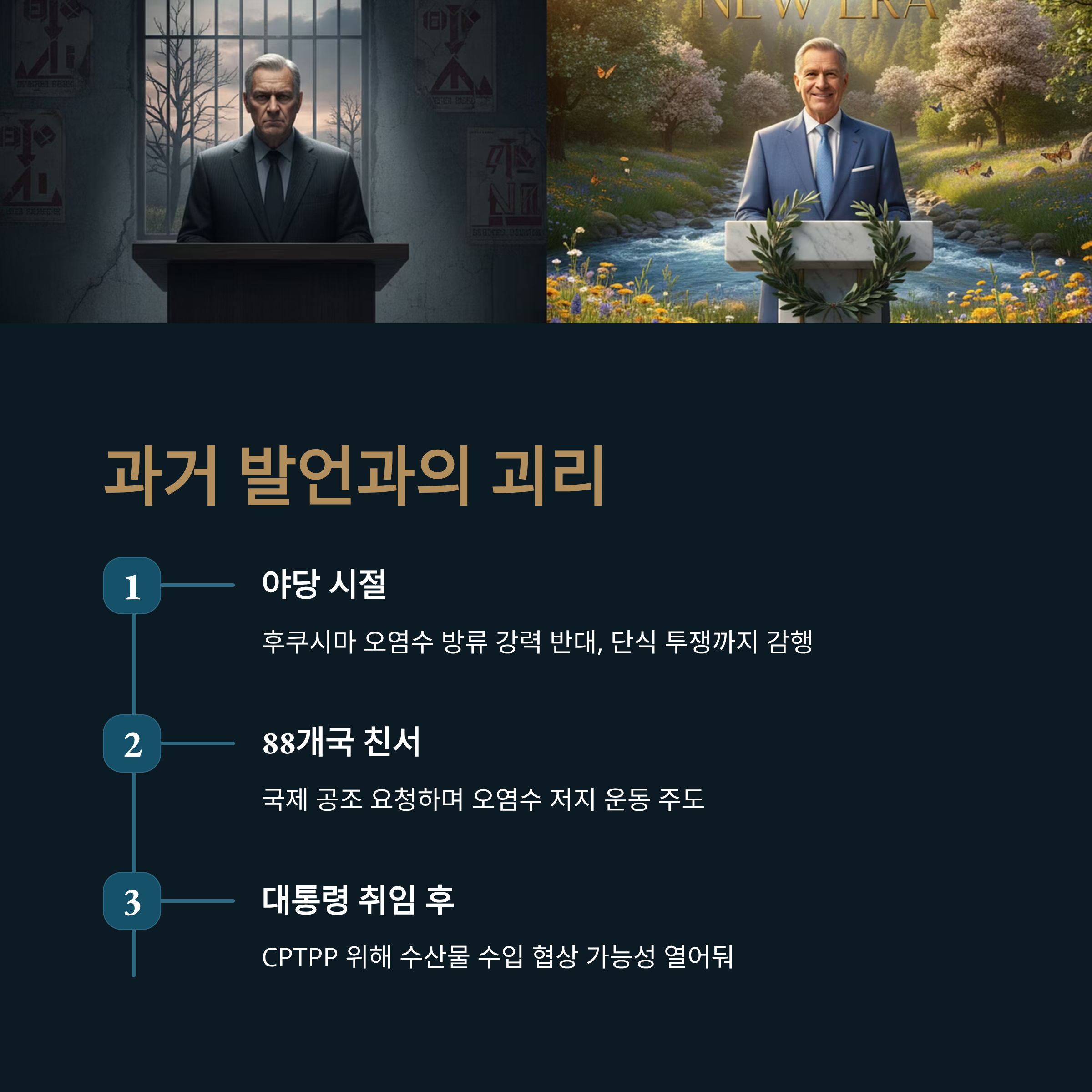 과거 야당 시절, 이재명 대표와 민주당은 윤석열 정부의 외교 정책을 비판하며 후쿠시마 오염수 문제를 가장 강력한 공격 수단으로 사용했습니다. 과학적 데이터를 무시하고 국민 불안을 조장하며, 수산물 수입은 절대 불가하다는 입장을 고수했습니다. 그러나 이제 대통령이 되어 CPTPP 가입이라는 경제적 실리가 걸리자, 과거의 주장을 뒤집고 일본과의 협상 가능성을 열어두는 모습을 보이고 있습니다. 이는 후쿠시마 문제를 국민 안전이 아닌, 정권 비판을 위한 정치적 도구로 사용했다는 비판을 피하기 어렵게 만듭니다.