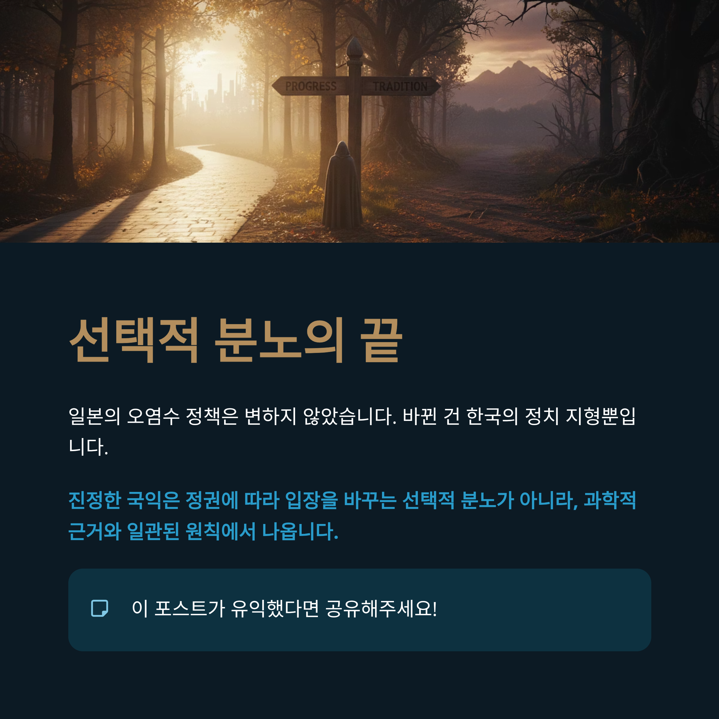 일본의 오염수 정책은 변한 것이 없는데, 한국의 정치 지형이 바뀌었다는 이유만으로 오염수가 청정수가 될 수는 없습니다. 이러한 일관성 없는 태도는 국가 정책에 대한 국민의 신뢰를 무너뜨리고, 외교 관계에서도 예측 불가능한 파트너라는 인식을 심어줄 뿐입니다. 진정으로 국익을 위한다면, 정권에 따라 입장을 바꾸는 '선택적 분노'가 아니라, 과학적 근거와 일관된 원칙에 기반한 정책을 추진해야 할 것입니다.