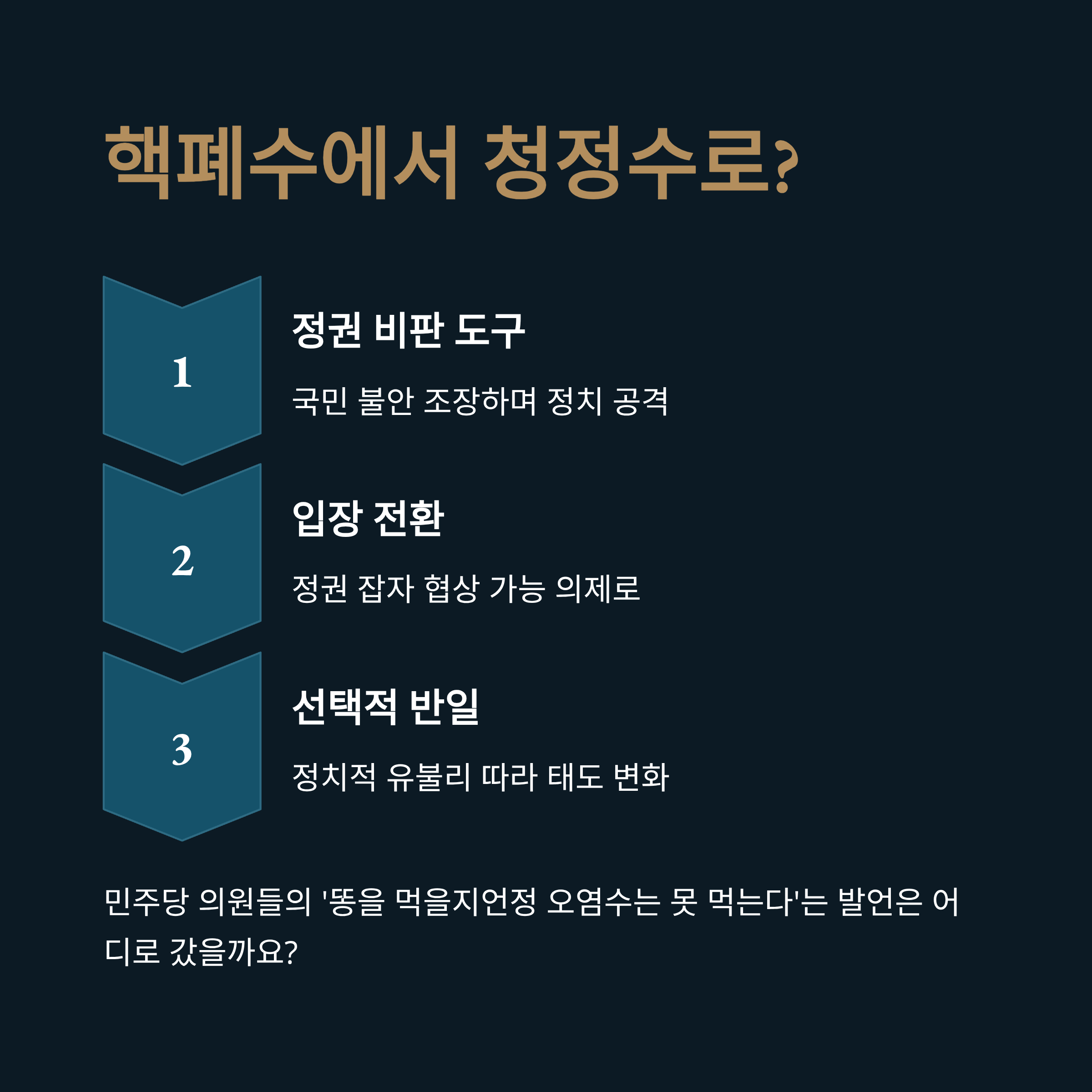 정권의 입장에 따라 과거 '핵폐수'라 비판하던 사안이 협상 카드가 되면서 '선택적 반일'이라는 비판이 제기됩니다.