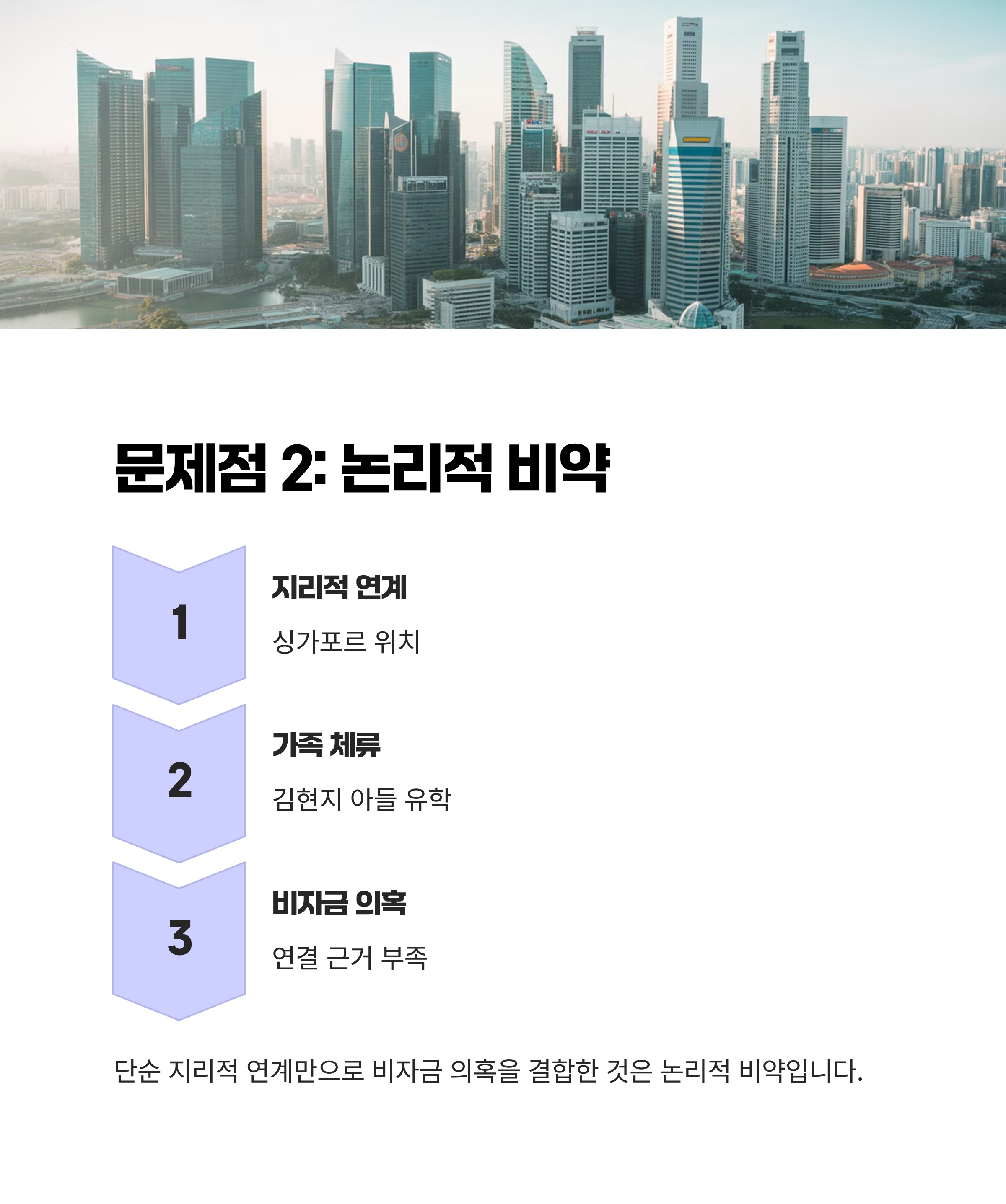 싱가포르라는 특정 지역과 김현지 가족의 체류 정보를 결합한 것은 의혹의 스토리를 더욱 풍부하게 만들지만, 아직까지 연결을 증명할 수 있는 사실적 근거는 부족합니다. 김현지 아들의 유학과 이재명 비자금 의혹을 단순히 지리적 연계만으로 결합한 것은 논리적 비약에 해당됩니다. 이러한 연계 주장은 오히려 의혹 신뢰도를 낮추는 요인이 될 수 있습니다.