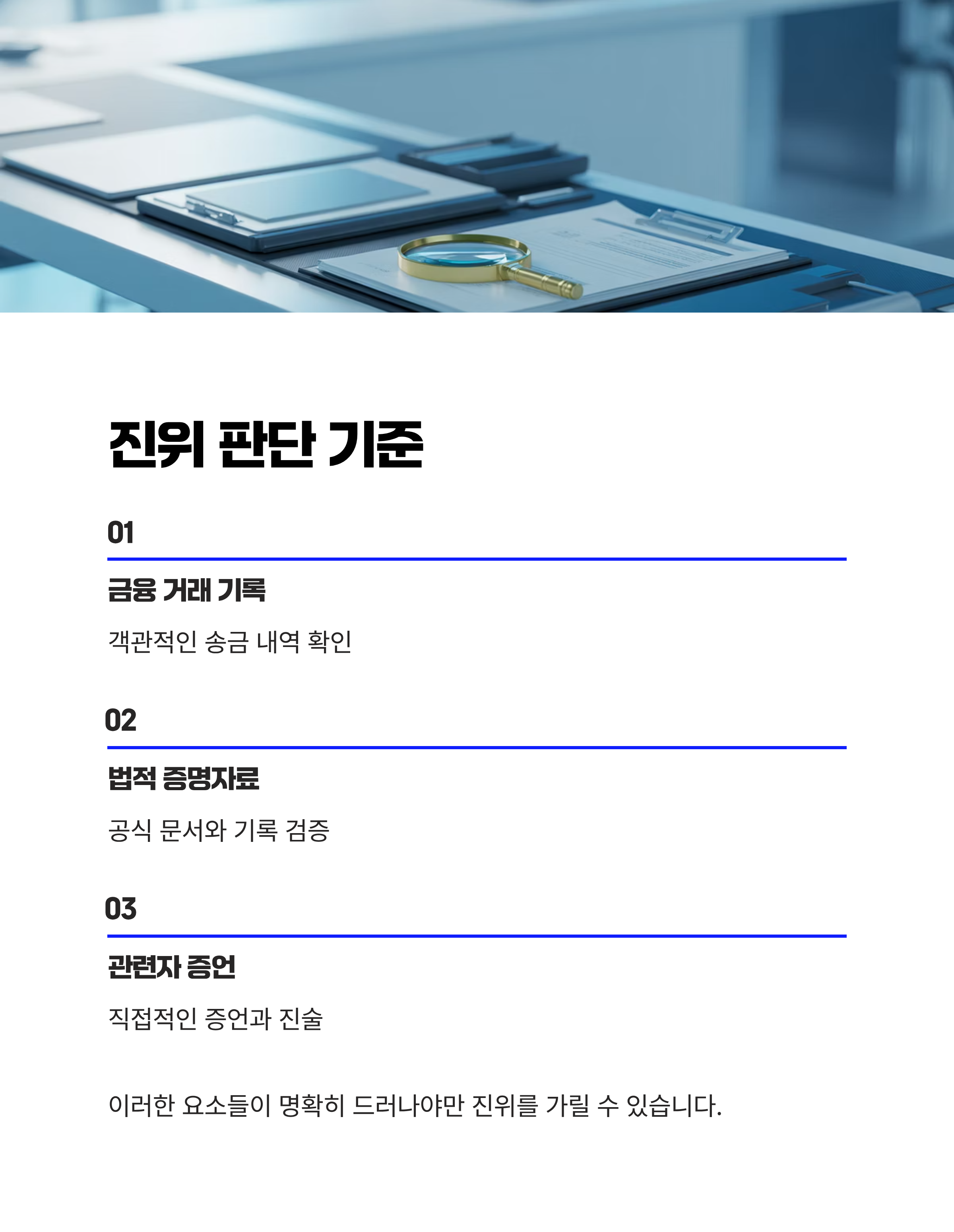A. 금융 거래 기록, 법적 증명자료 및 관련자의 직접 증언 등이 핵심입니다. 이러한 요소들이 명확히 드러나야만 진위를 가릴 수 있습니다. |