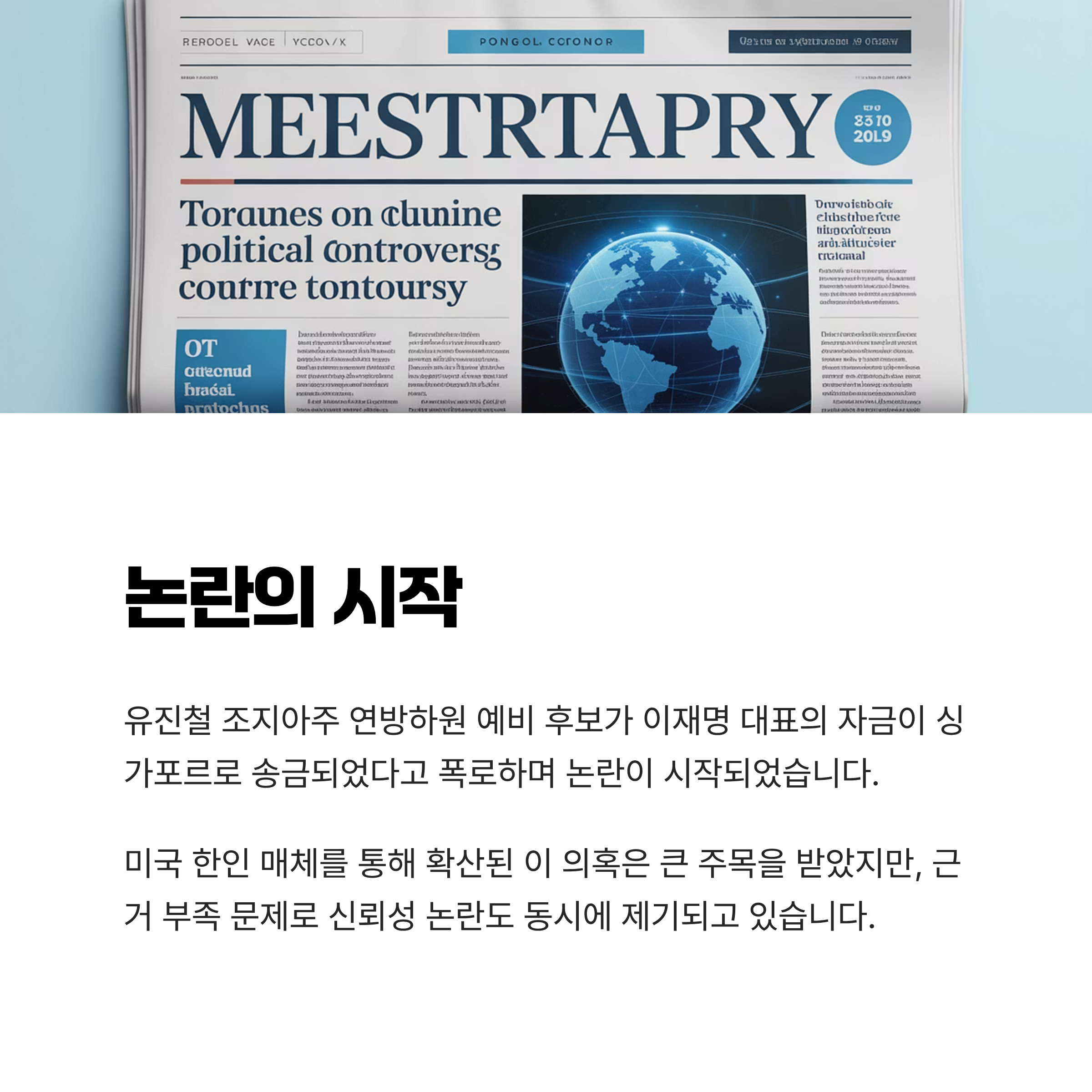 최근 이재명 대표를 둘러싼 신규 의혹이 미국 미디어를 중심으로 떠오르고 있습니다. "싱가포르 저수지"라 불리는 자금을 이재명이 관리하고 있다는 주장은 특히 유진철 조지아주 연방하원 예비 후보의 발언으로 큰 주목을 받았습니다. 이러한 의혹은 한미일보와 미국 한인 매체를 통해 보도되며 폭넓게 알려지게 되었으나, 근거 부족 문제로 신뢰성에 대한 논란과 의문도 동시에 제기되고 있습니다. 싱가포르 해외 체류와 연관된 인물들, 특히 김현지와 그의 가족이 관련된 내용이 부각되며 여론의 관심이 집중되고 있습니다. 대장동, 백현동 개발 비리와 연결될 가능성도 제기되는 상황입니다. 하지만 이러한 주장들은 아직 명확한 증거가 확인되지 않았습니다. 이번 글에서는 이 문제를 심층적으로 탐구하며, 어떠한 요인들이 관련 의혹을 부풀리고 있는지 분석해봅니다.