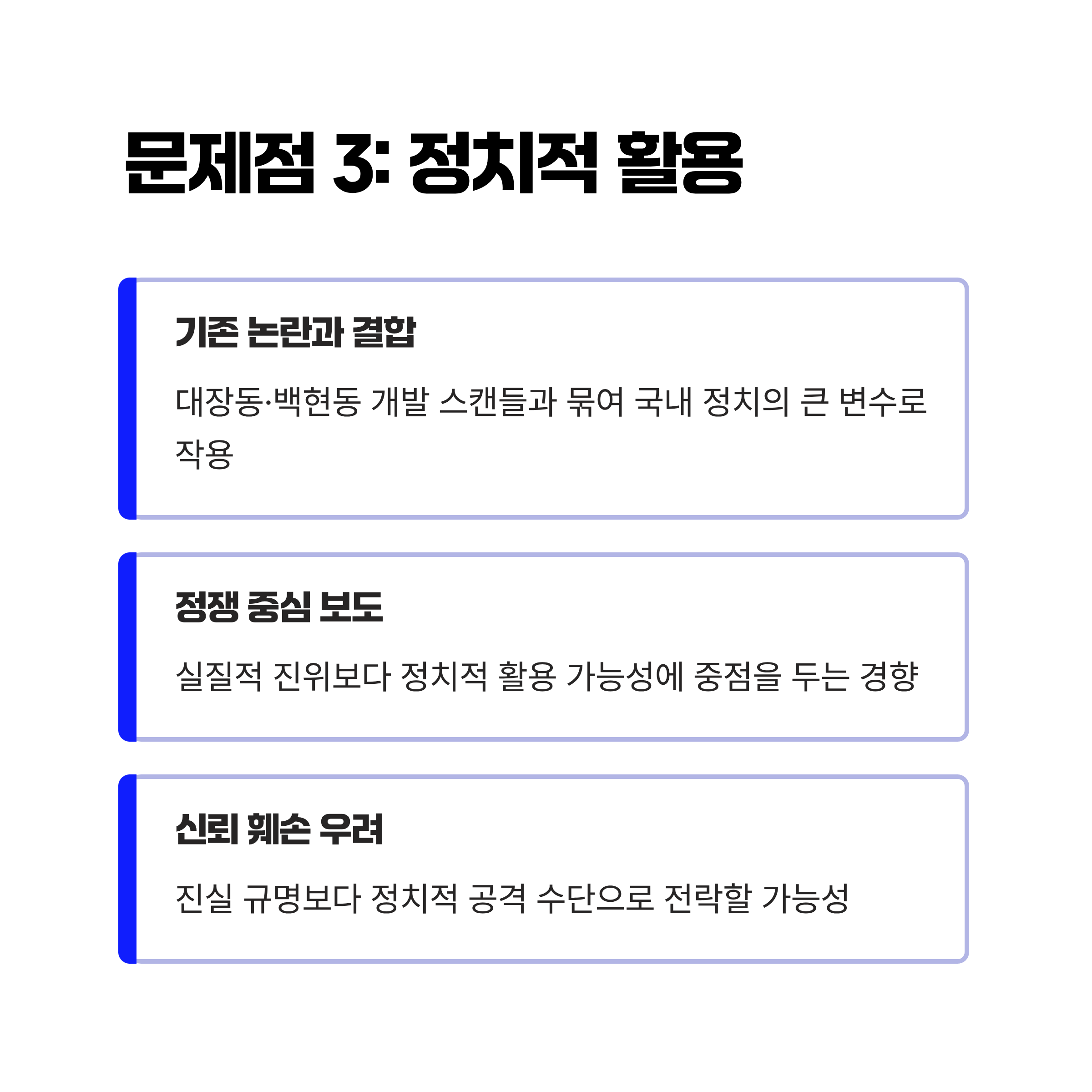 이번 의혹 제기는 이재명과 관련된 기존 논란, 즉 대장동 및 백현동 개발 스캔들과 묶여 있어 국내 정치의 큰 변수로 작용하고 있습니다. 정쟁 중심의 보도는 의혹의 실질적 진위보다는 정치적 활용 가능성에 중점을 두는 경우가 많습니다. 이런 흐름은 국민적 신뢰를 훼손할 우려가 있으며, 실질적 진실 규명보다는 정치적 공격의 수단으로 전락할 가능성을 내포하고 있습니다.