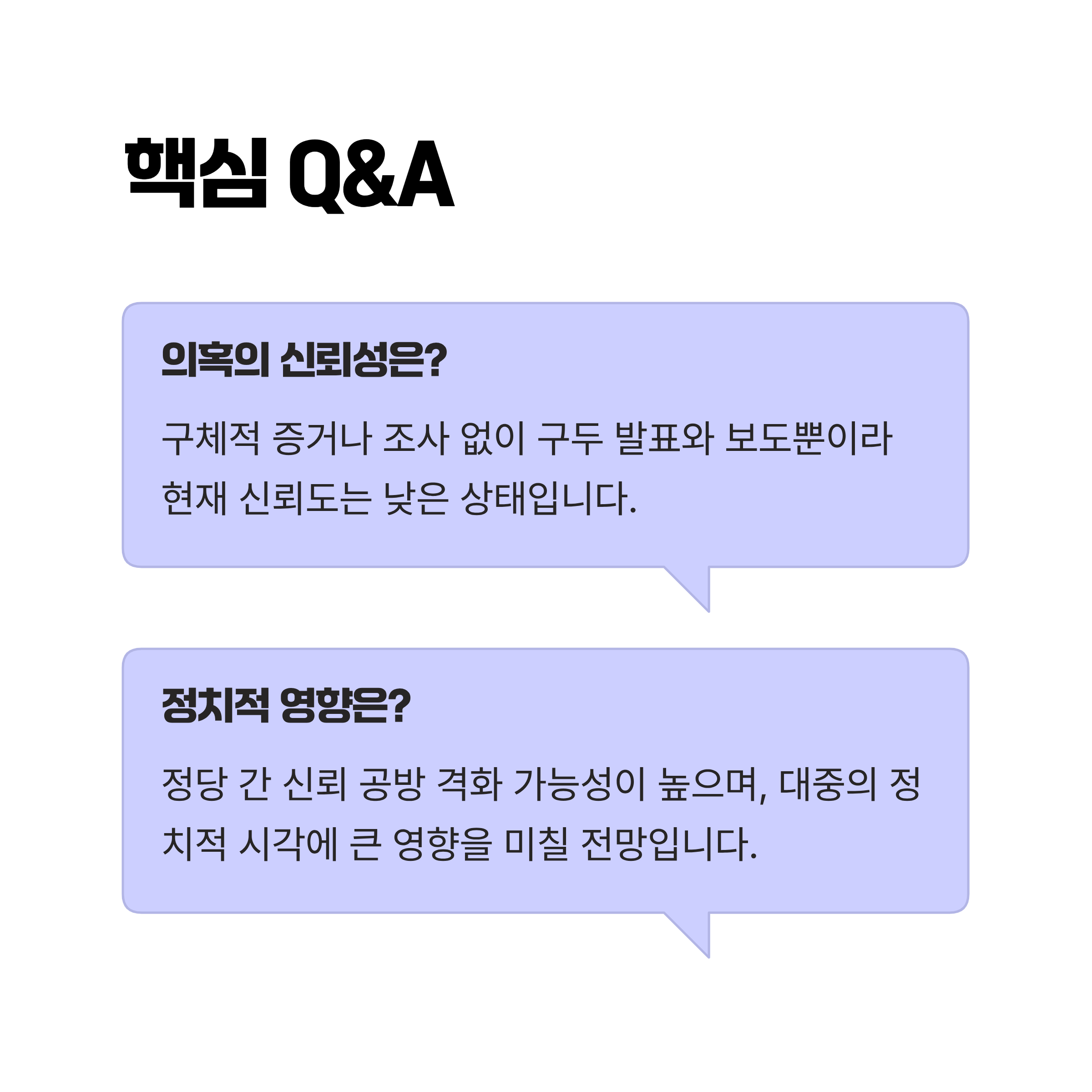A. 주요 정당 간의 정치적 신뢰 공방이 격화될 수 있으며, 특히 대중의 정치적 시각에 큰 영향을 미칠 가능성이 높습니다. 장기적으로는 관련 법제 정비 필요성이 대두될 전망입니다. |