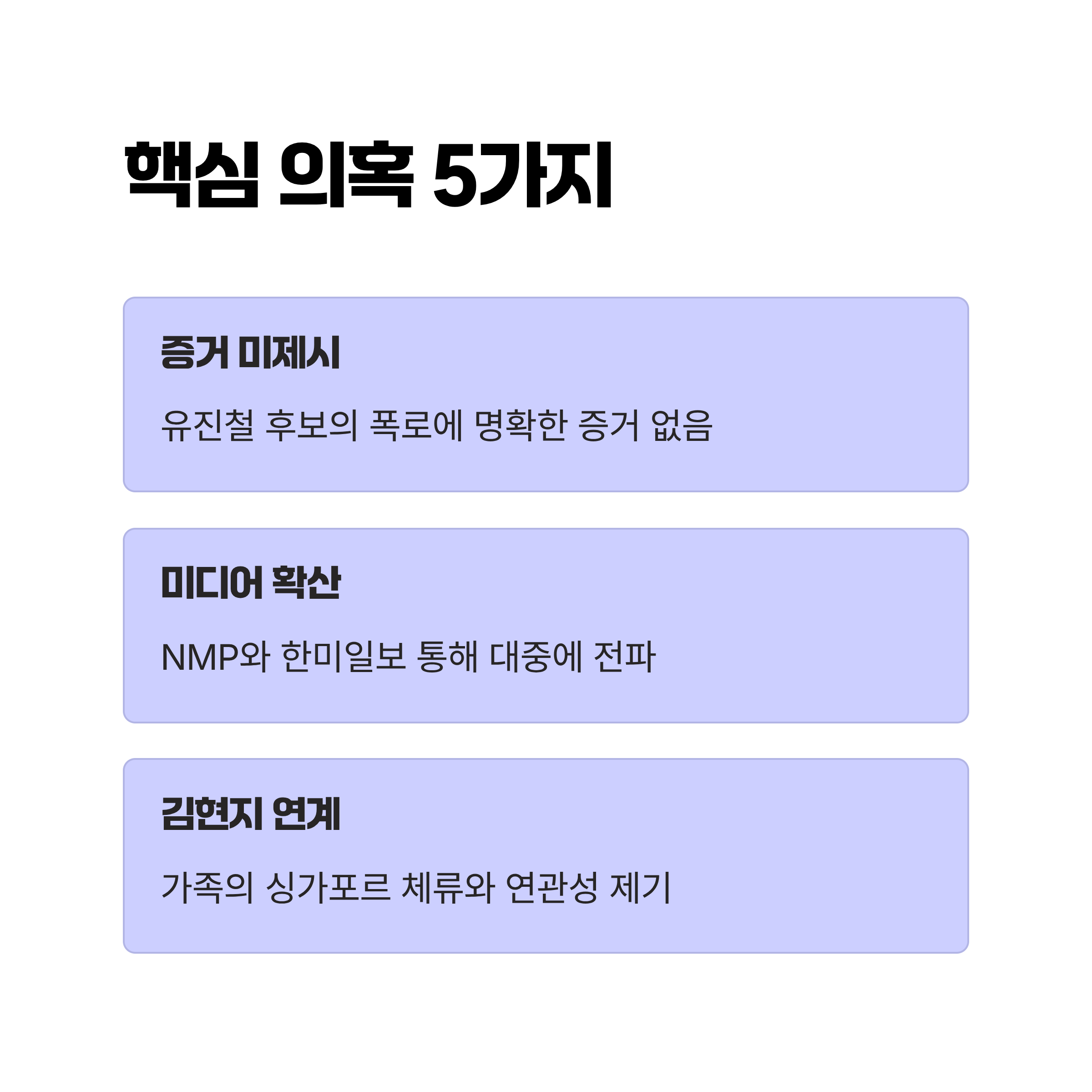 1. 유진철 후보는 이재명의 자금이 싱가포르로 송금되었다고 폭로했지만, 명확한 증거는 제시되지 않음.
