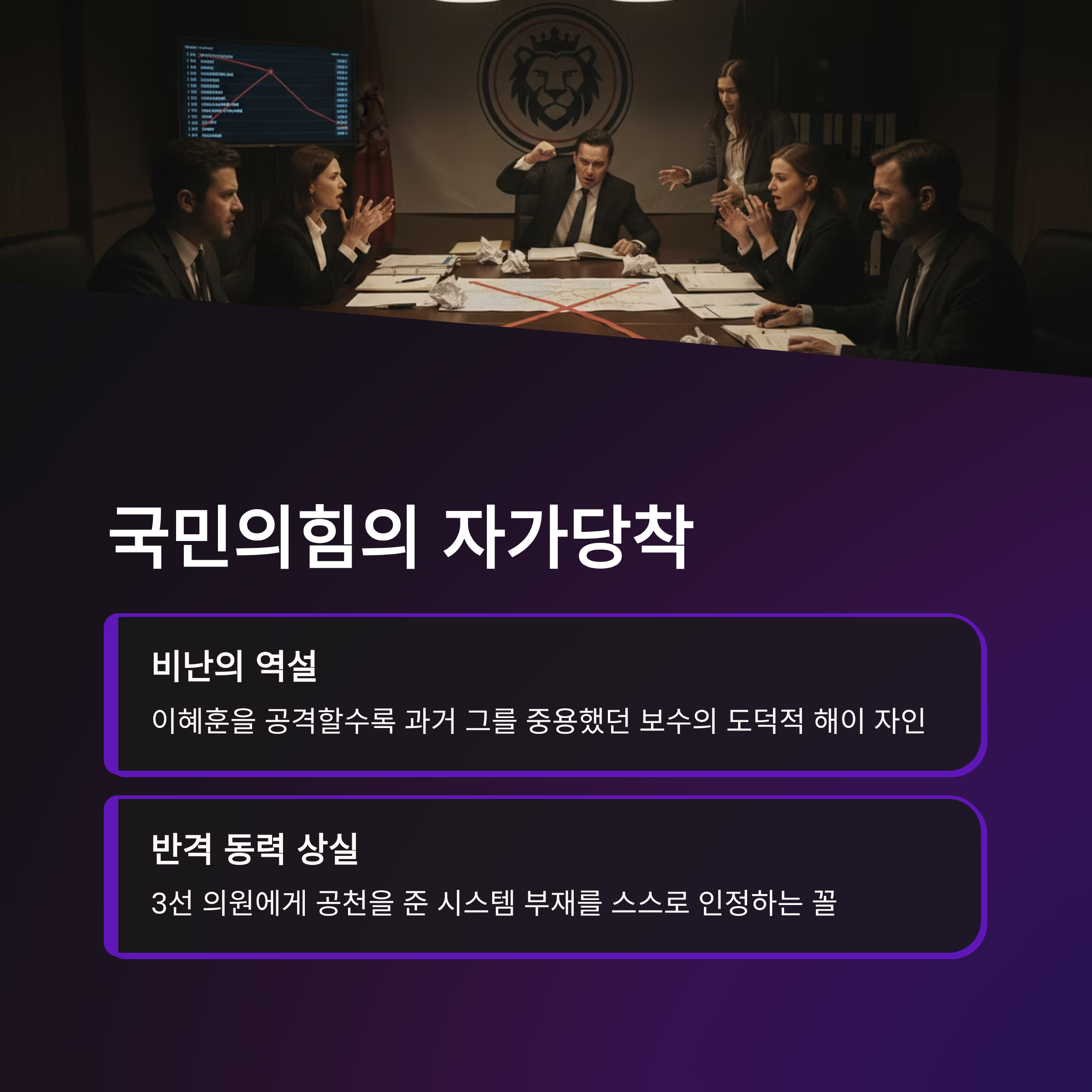 국민의힘의 자가당착: 이해훈을 비난할수록 과거 그를 중용했던 보수 정당의 도덕적 해이와 시스템 부재를 스스로 인정하는 꼴이 되어 반격의 동력을 상실했습니다.