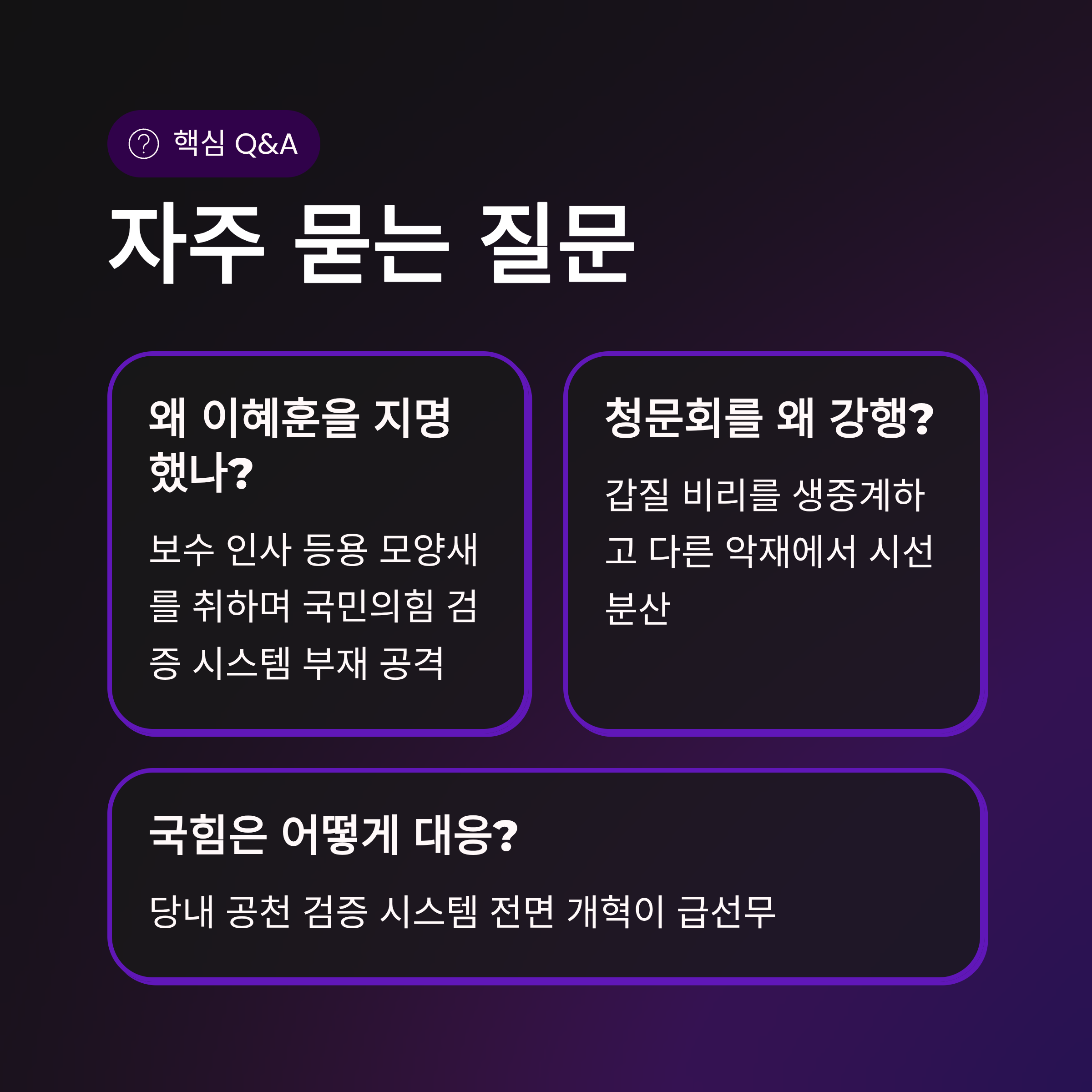 이슈 전환 효과: '선우·김경 돈 공천' 의혹 및 가신 김현지 관련 등 정권에 불리한 이슈를 이해훈 청문회 논란으로 덮으며 여론의 시선을 성공적으로 분산시켰습니다.