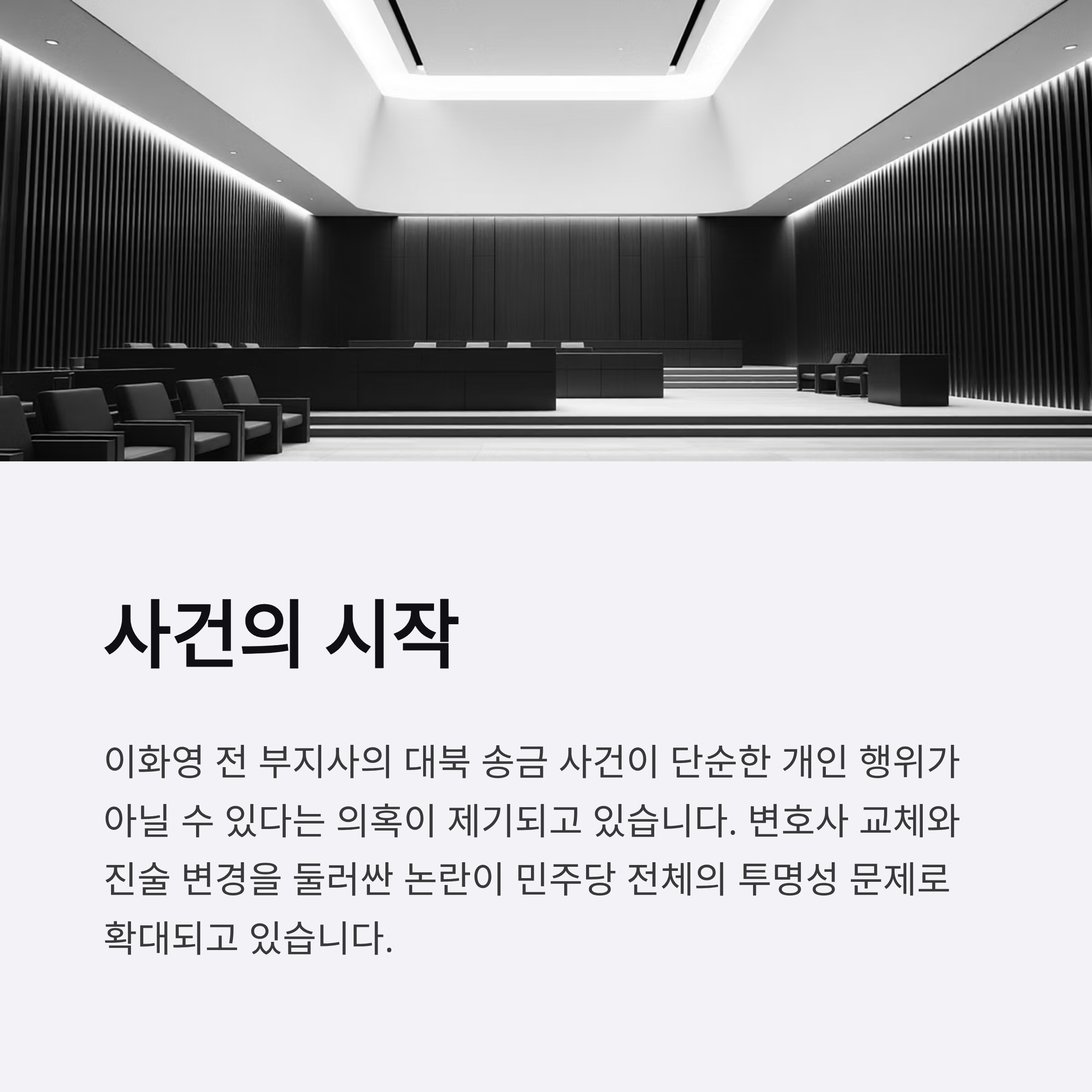민주당을 둘러싼 정치적 논란이 또다시 뜨거운 쟁점이 되고 있습니다. 특히 이화영 전 부지사가 폭로한 대북 송금 사건은 당 지도부인 이재명과의 연결 고리가 지적되며 격론의 한가운데로 떠오르고 있습니다. 사건 초기에는 이화영의 단독 행각으로 보였던 일련의 행위들이, 변호사 교체 사건과 더불어 다양한 개입 의혹으로 점점 복잡한 양상을 띄고 있습니다.