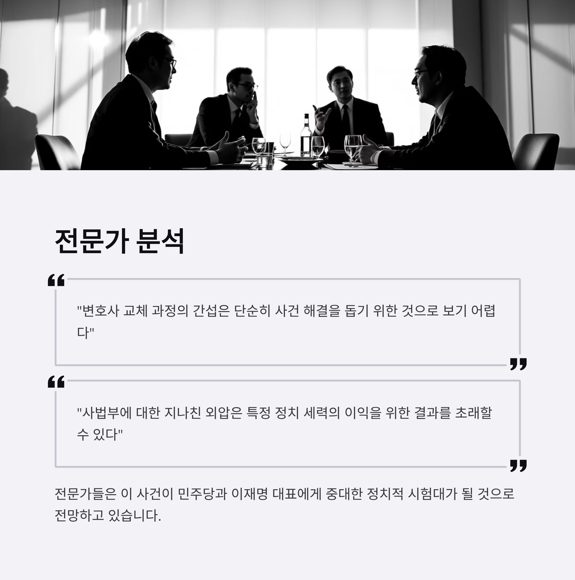 설주한 변호사는 사건 초기에 적극적으로 방어 논리를 전개했으나, 예기치 않게 사임했습니다. 김현지 실장으로부터 받은 압력과 굴욕적인 언행이 주요 원인으로 지목되고 있습니다. 만약 설 변호사가 표현한 상황이 사실로 밝혀진다면, 이는 민주당 측의 사건 조작 가능성을 뒷받침하는 구체적 근거가 될 것입니다. 이후 새로 선임된 변호사가 이화영 진술을 번복하면서 사건의 흐름은 더욱 예측 불가능한 방향으로 전개되고 있습니다. 이는 공판 과정에서 마치 정치적 고려가 개입된 최종 결과를 예고하는 듯한 인상을 주고 있습니다.