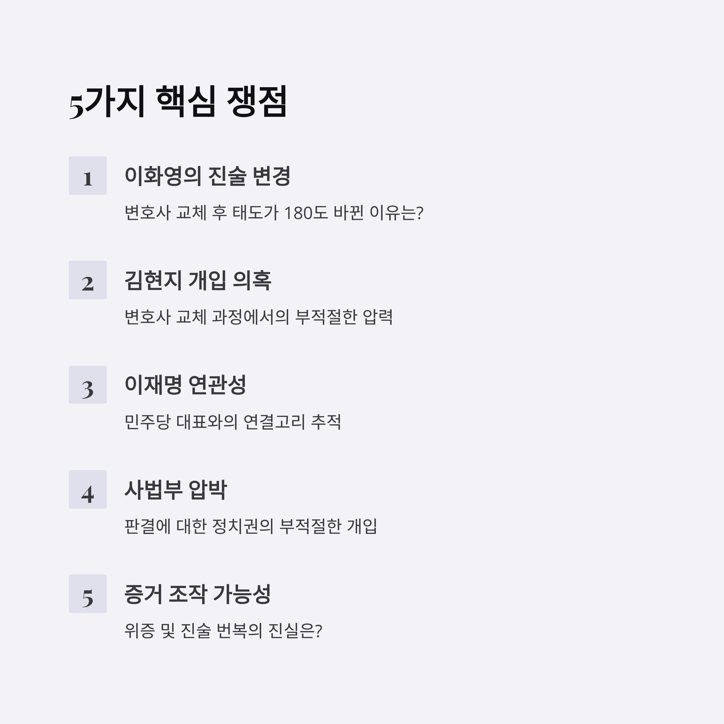 4. 이화영의 공판과 관련하여 공론화된 위증 및 증거 조작 가능성은 이재명 리더십을 더욱 시험대에 올릴 전망.
